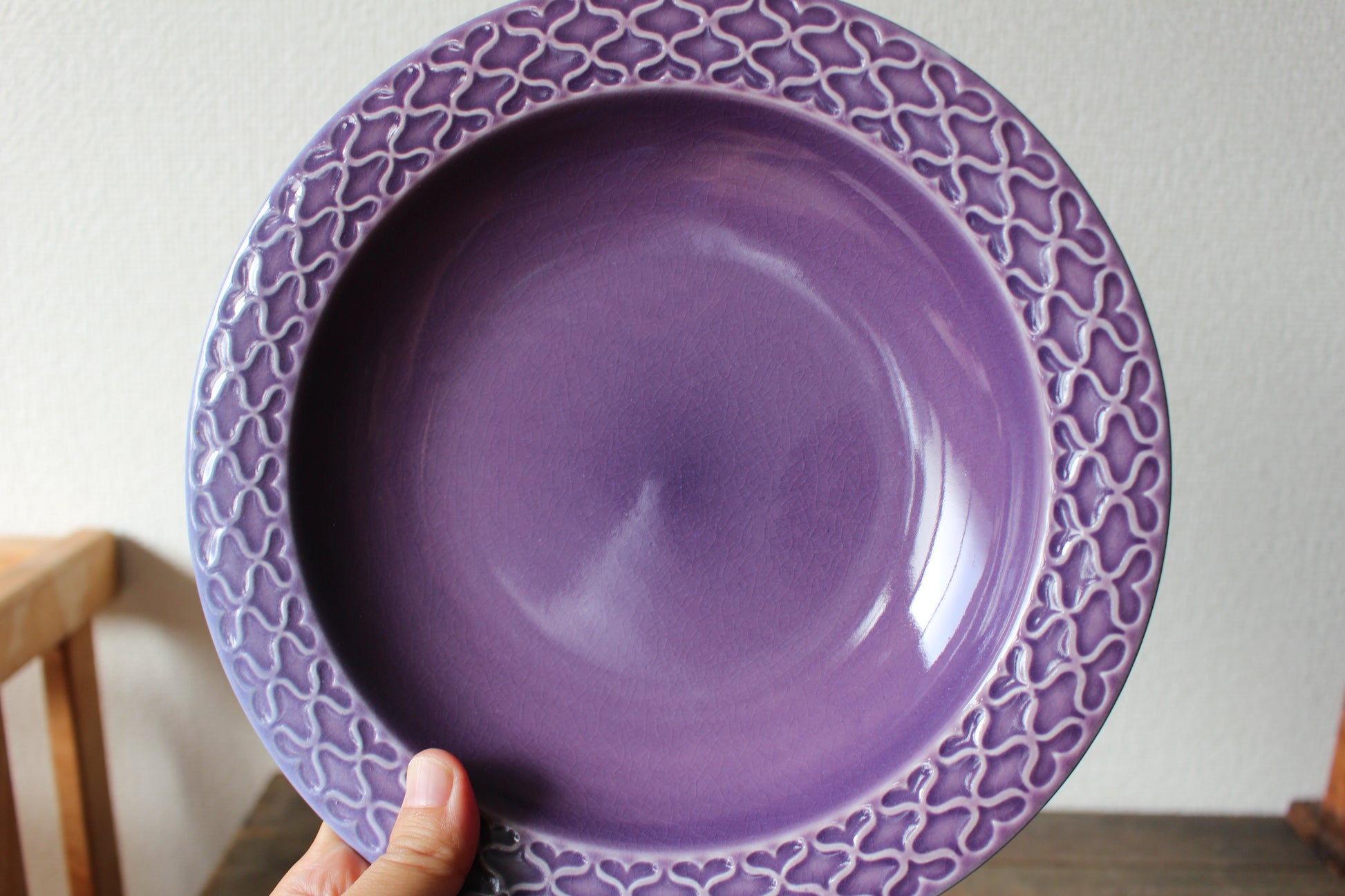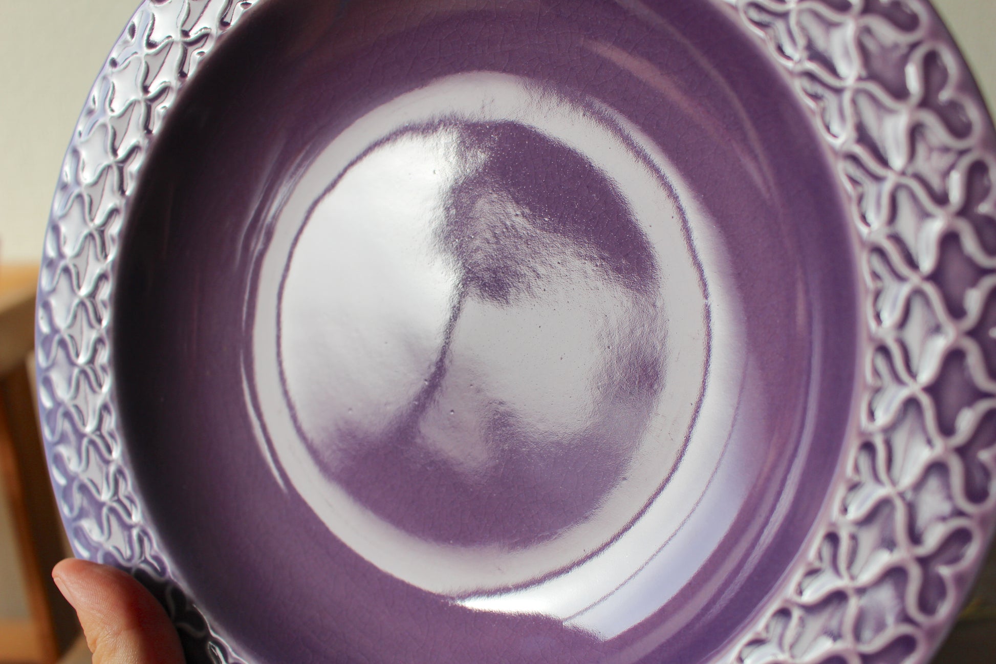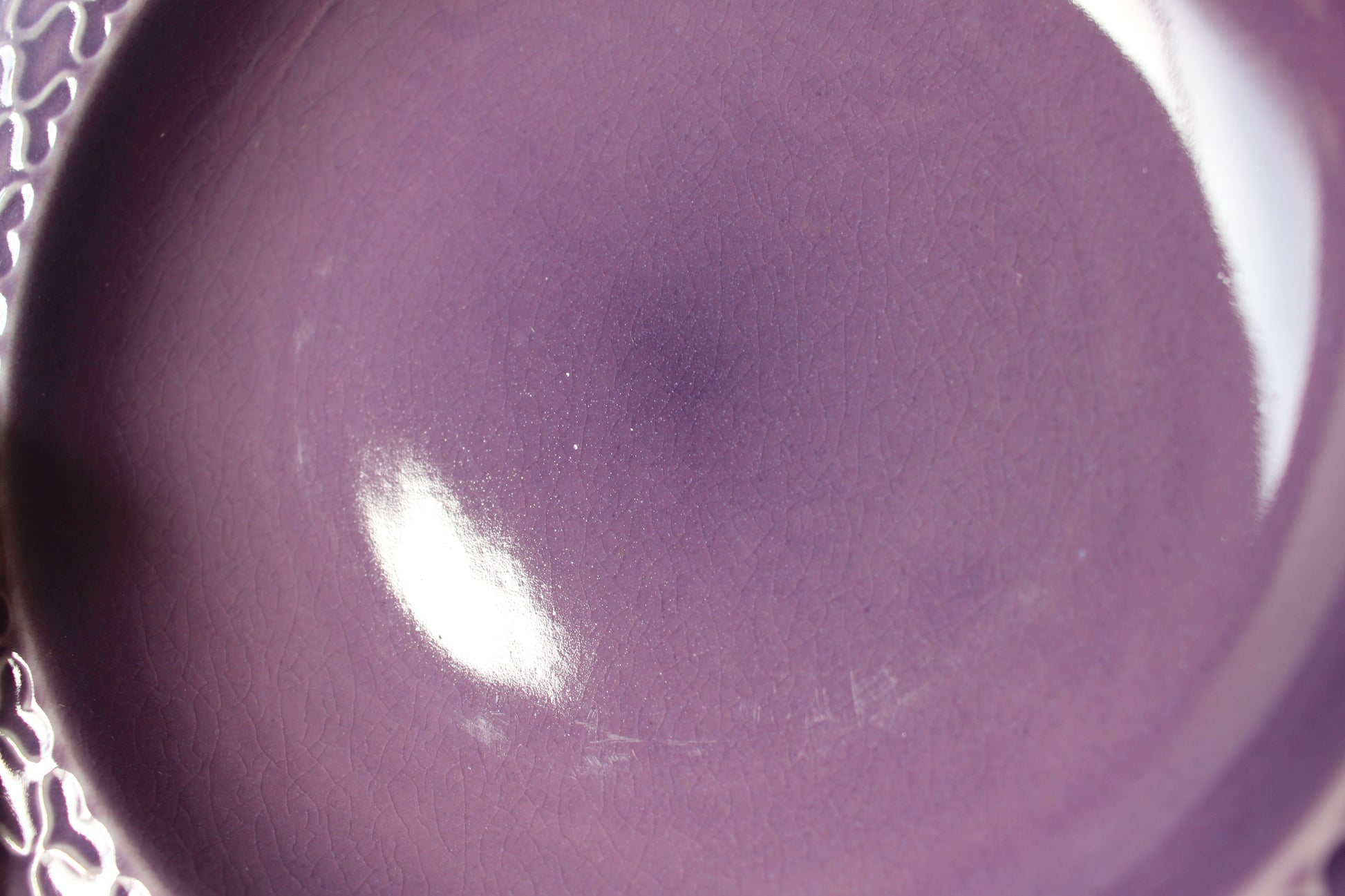 縁にかけて僅かにパープルから青色のグラデーションのようになってる箇所があります。製造時の焼き加減のものと思われます。完璧なパープル一色をご希望の方はご遠慮ください。