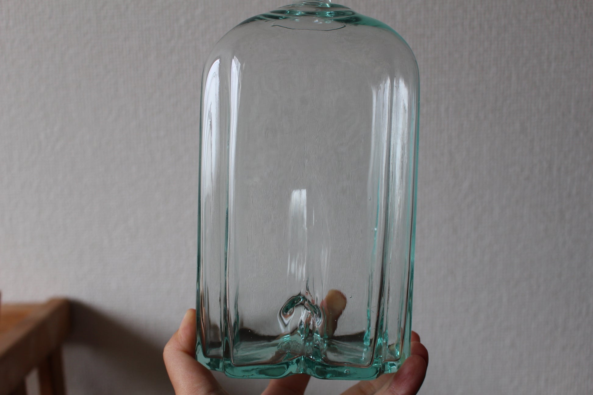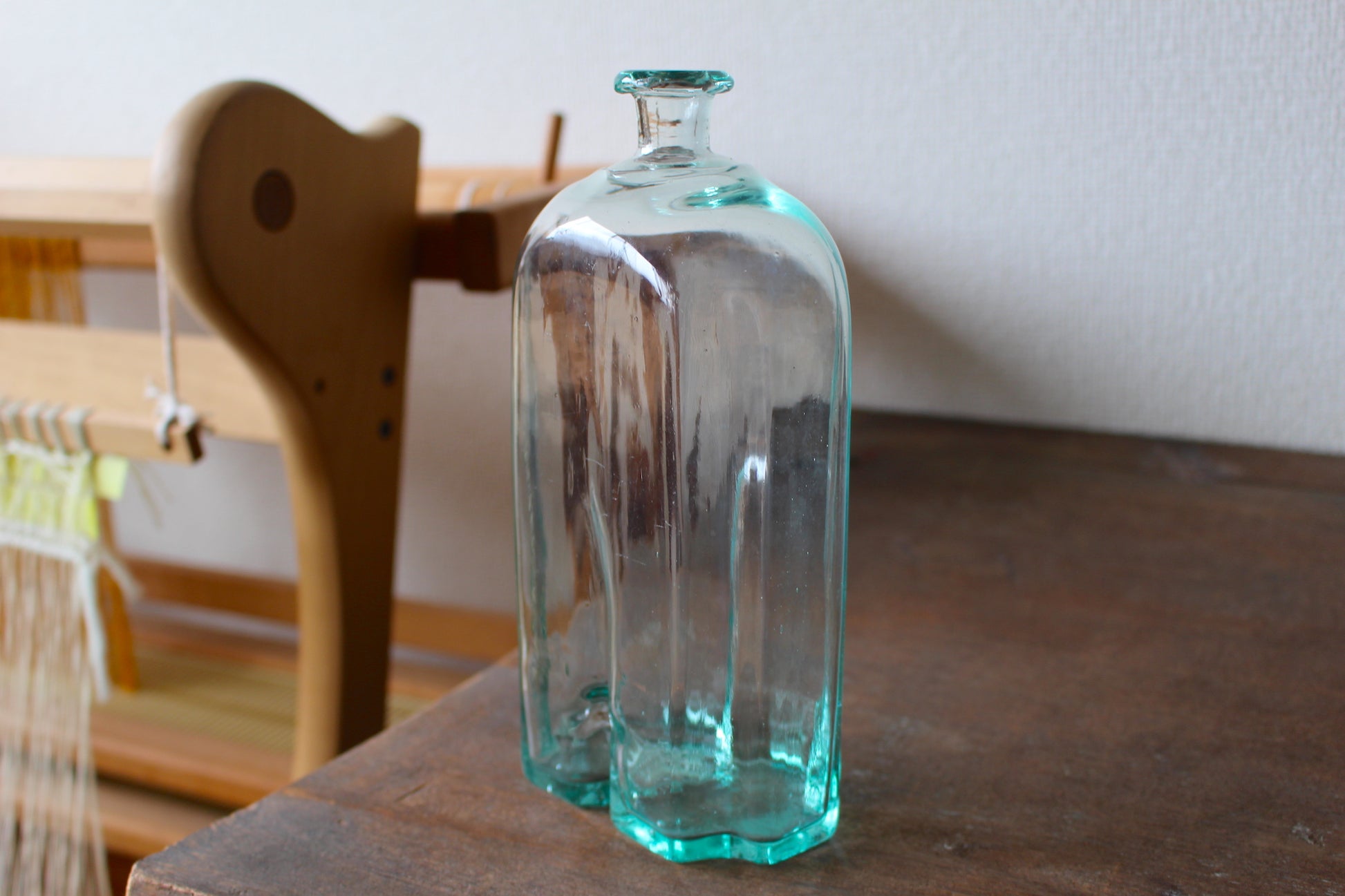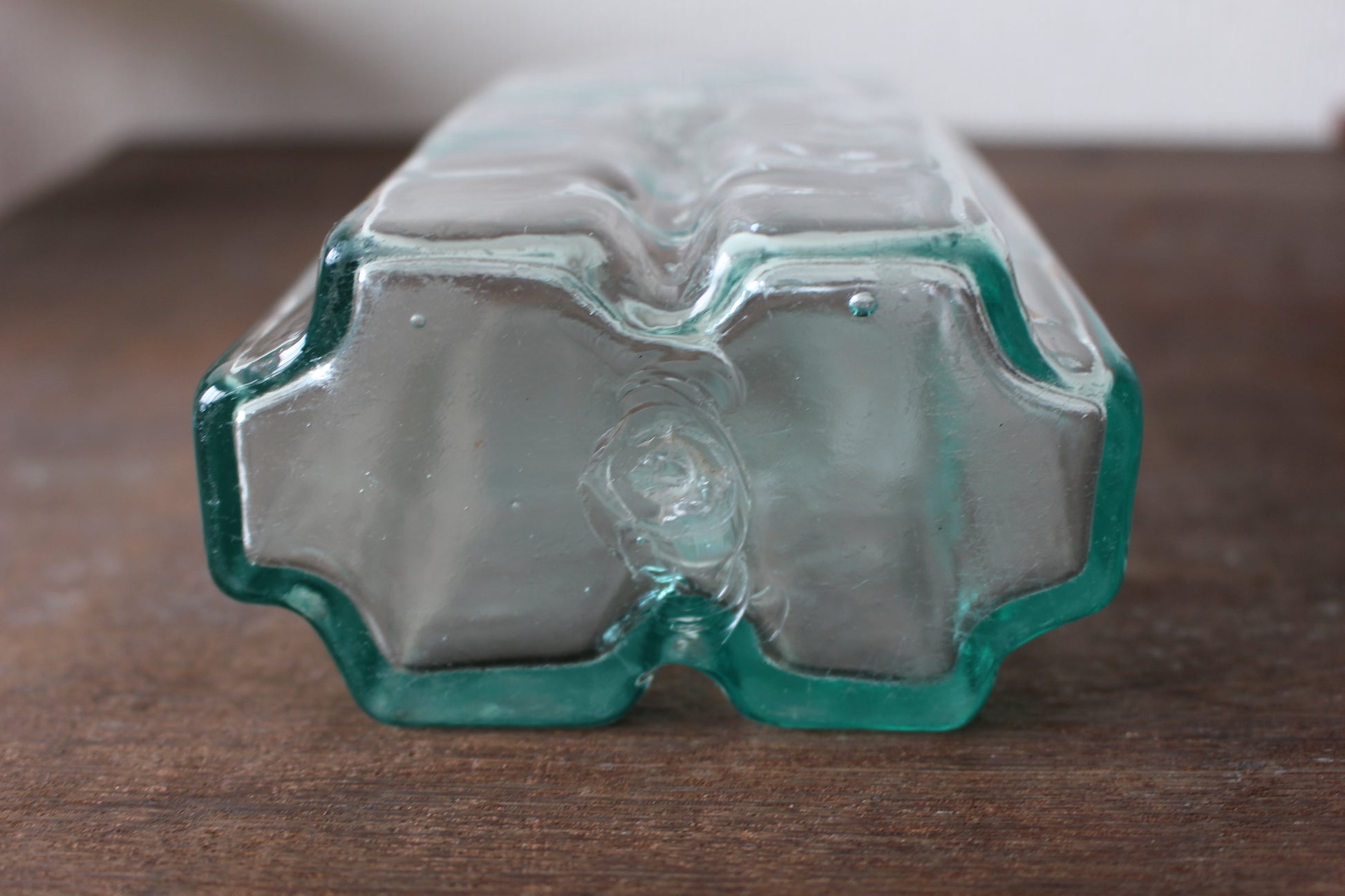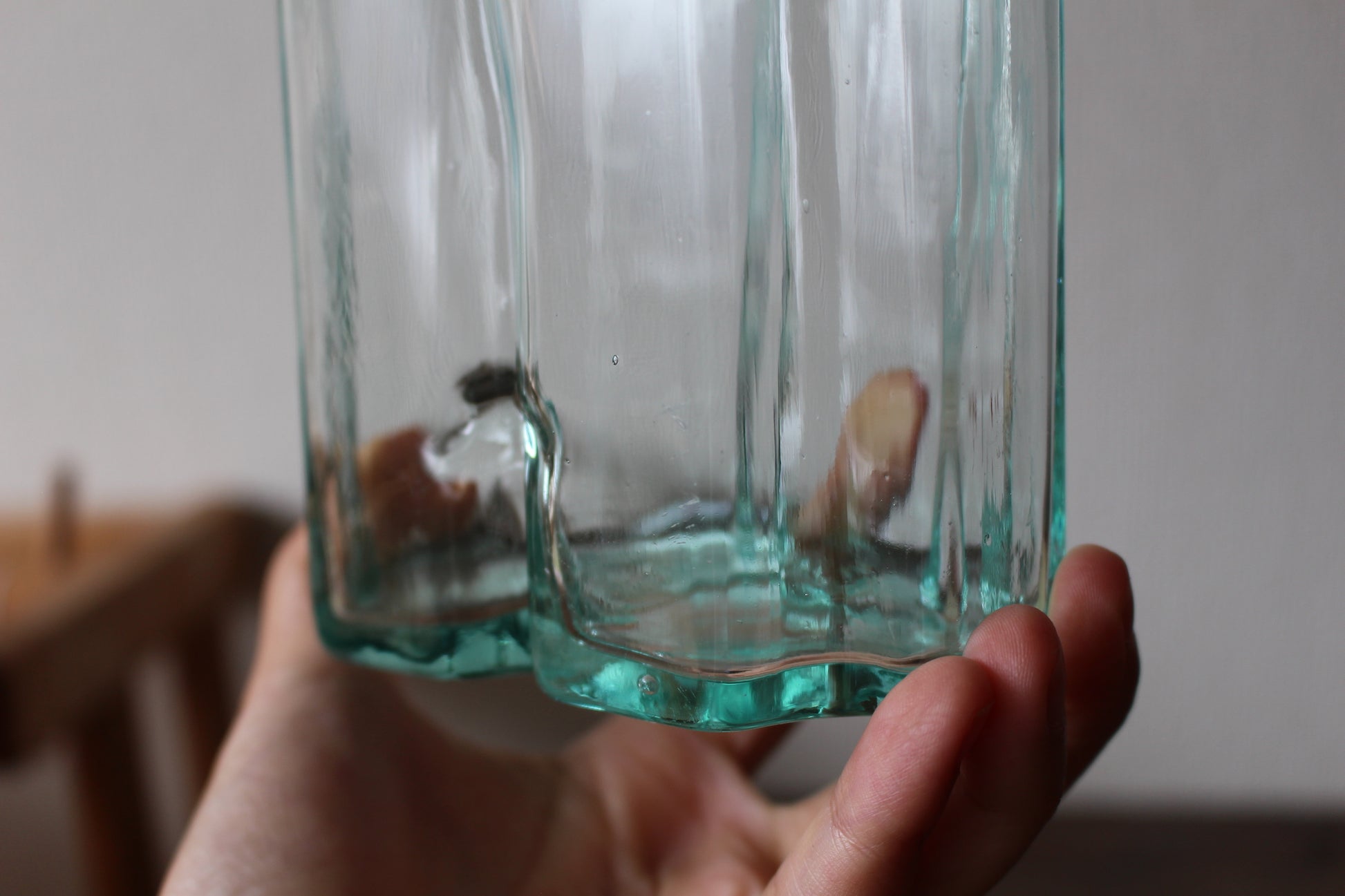古い吹きガラス独特の美しさに、ユニークなフォルム、優しいターコイズ色がとても魅力的なアンティーク品です。