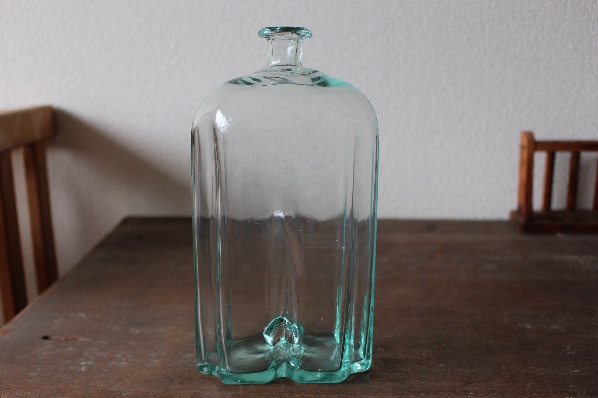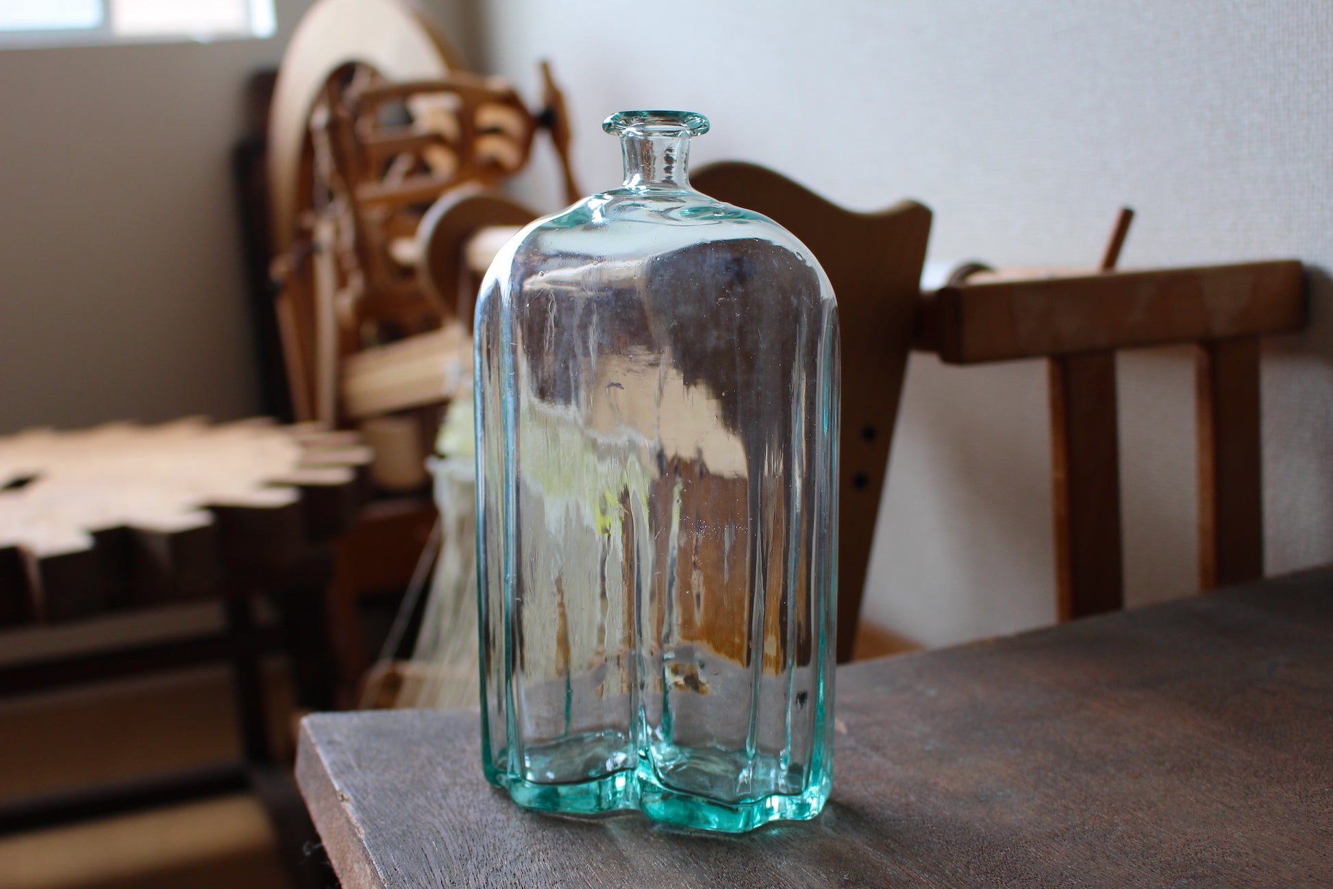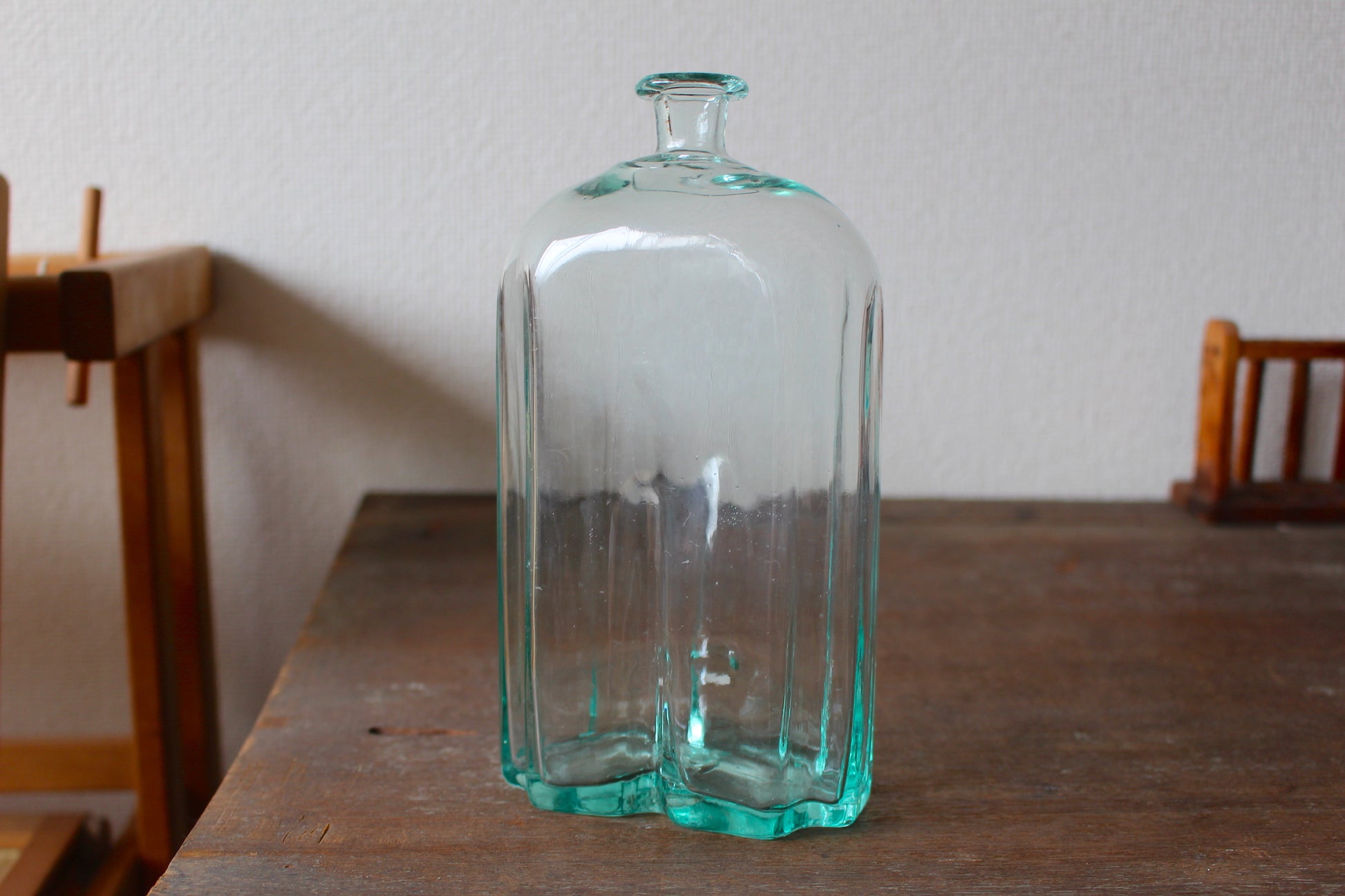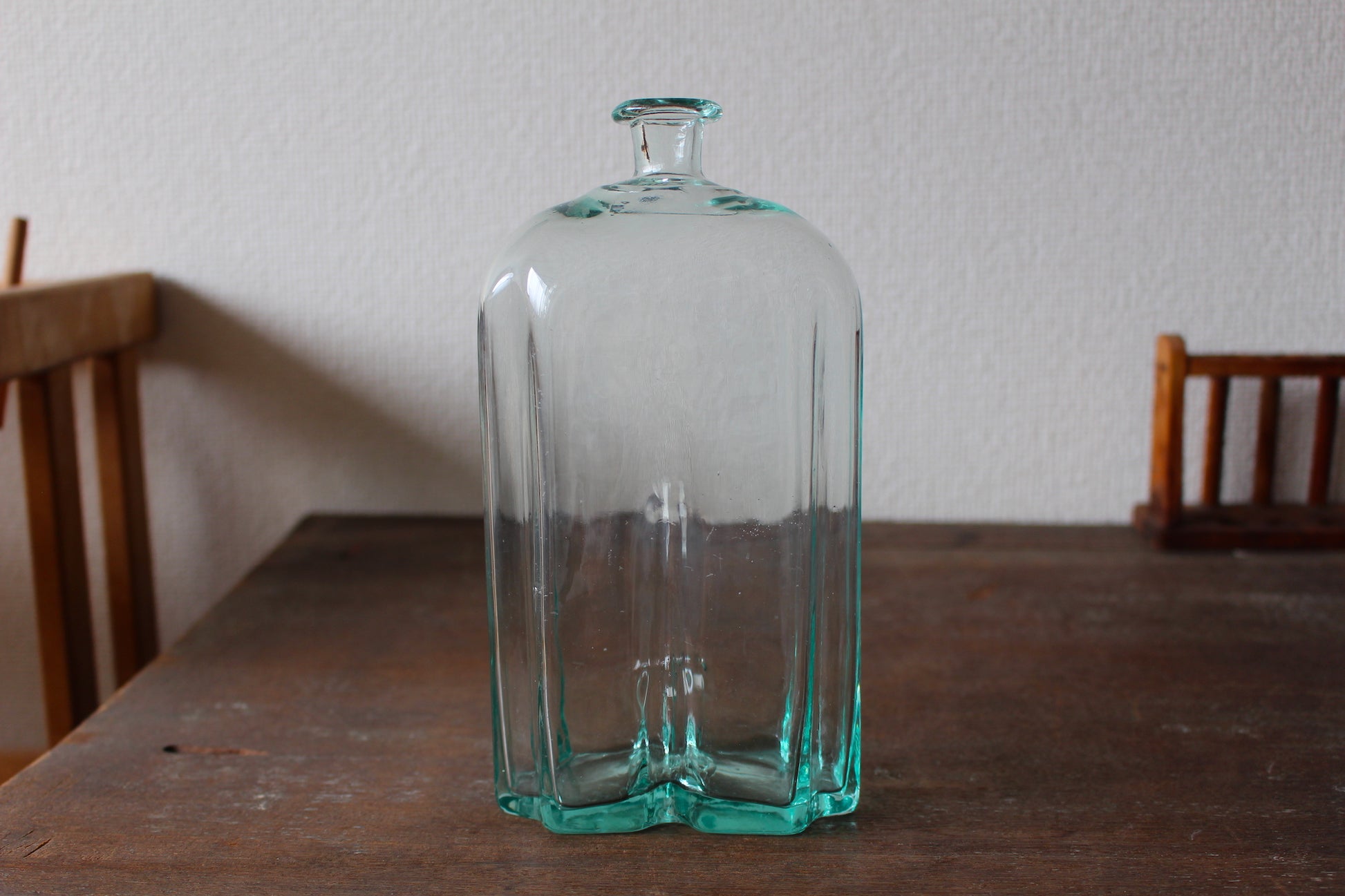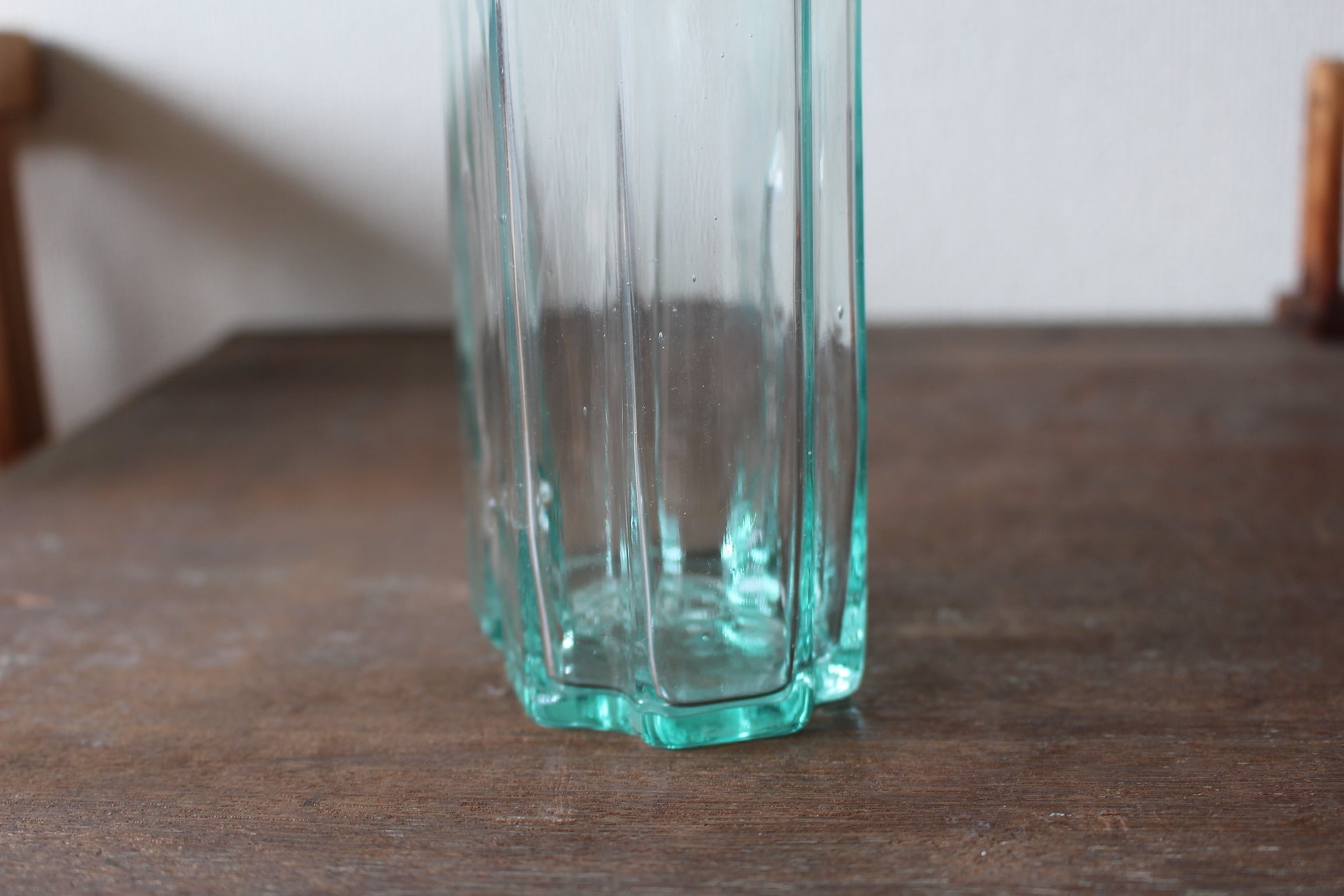 古い吹きガラス独特の美しさに、ユニークなフォルム、優しいターコイズ色がとても魅力的なアンティーク品です。