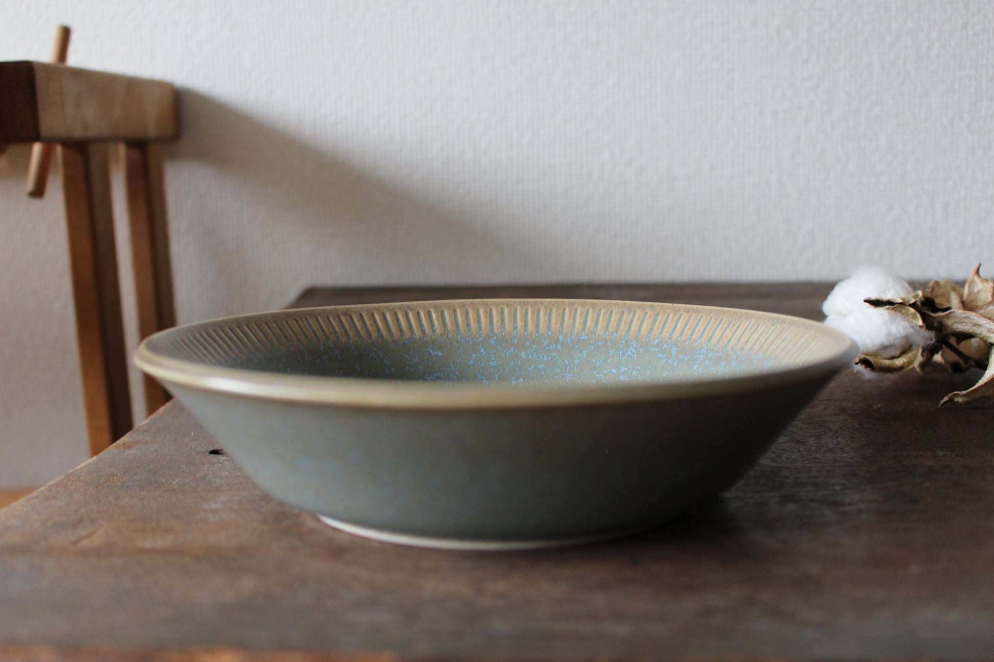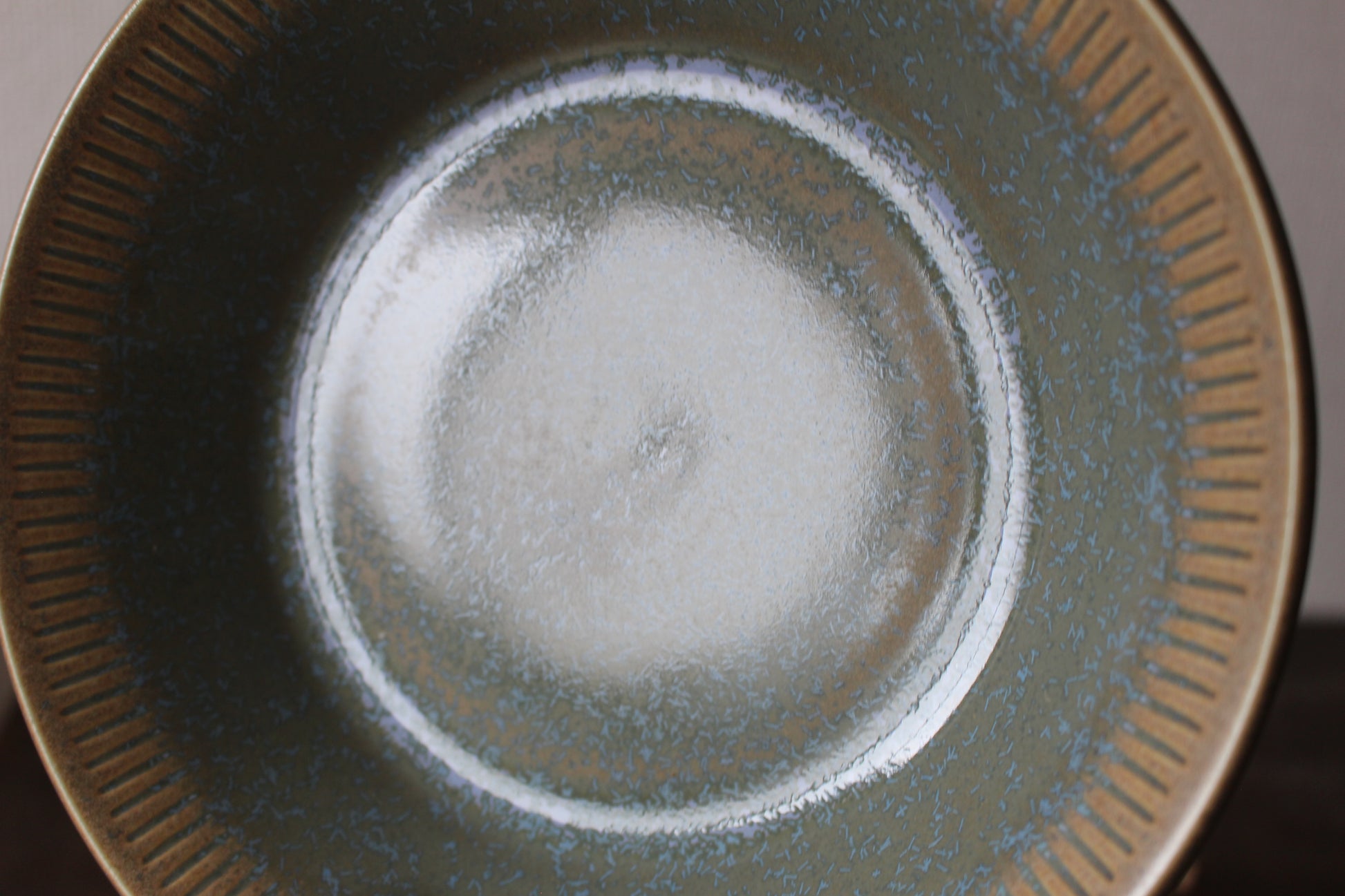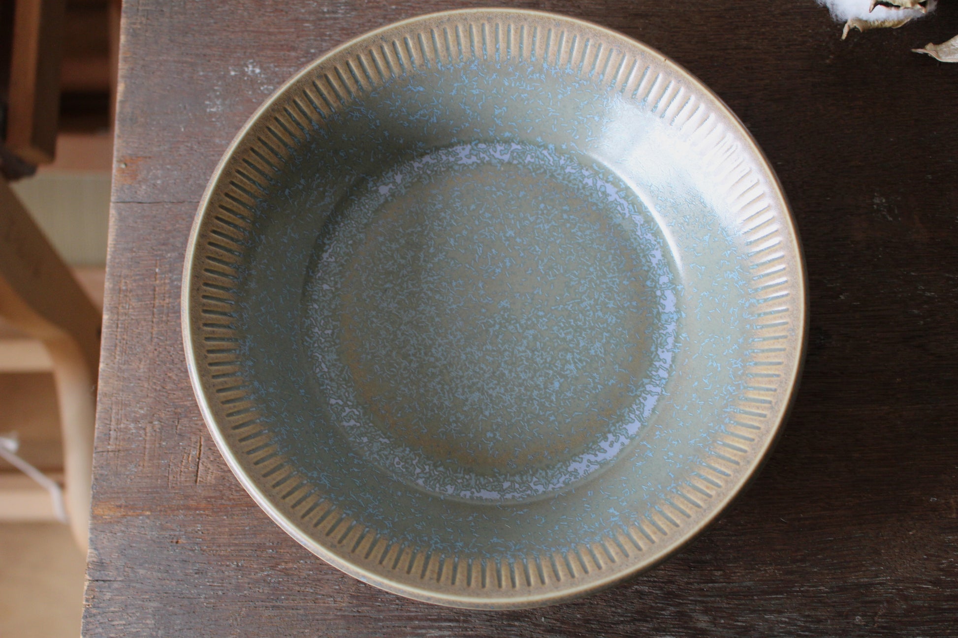 1907年にデンマークで創業されたナブストラップ(Knabstrup)社の、ヌーボー(Nøddebo)というシリーズのボウルです。すっきりしたフォルムに、溶け込むようなベージュとブルーの釉薬のグラデーションがとても美しい製品です。1988年に廃業となり、元々生産数の少ない希少なシリーズですが、このサイズのボウルはさらに珍しいお品です。