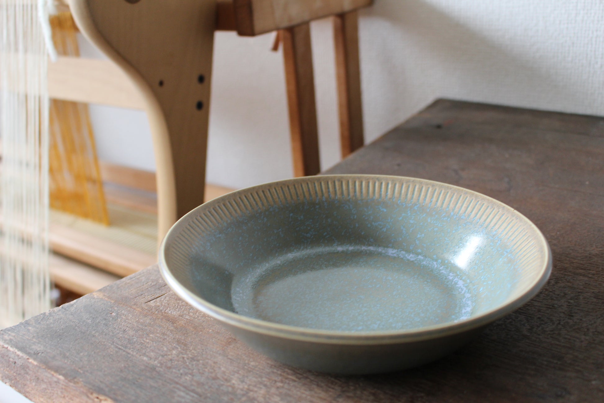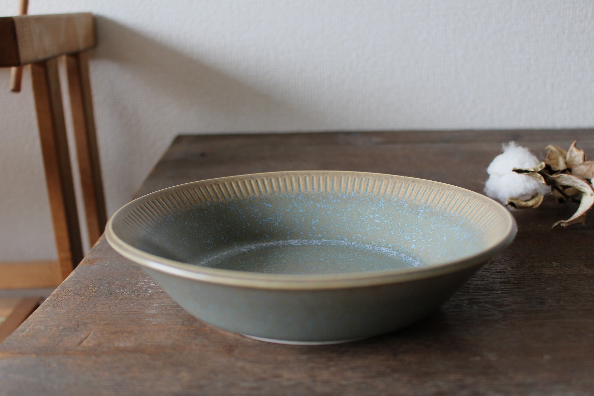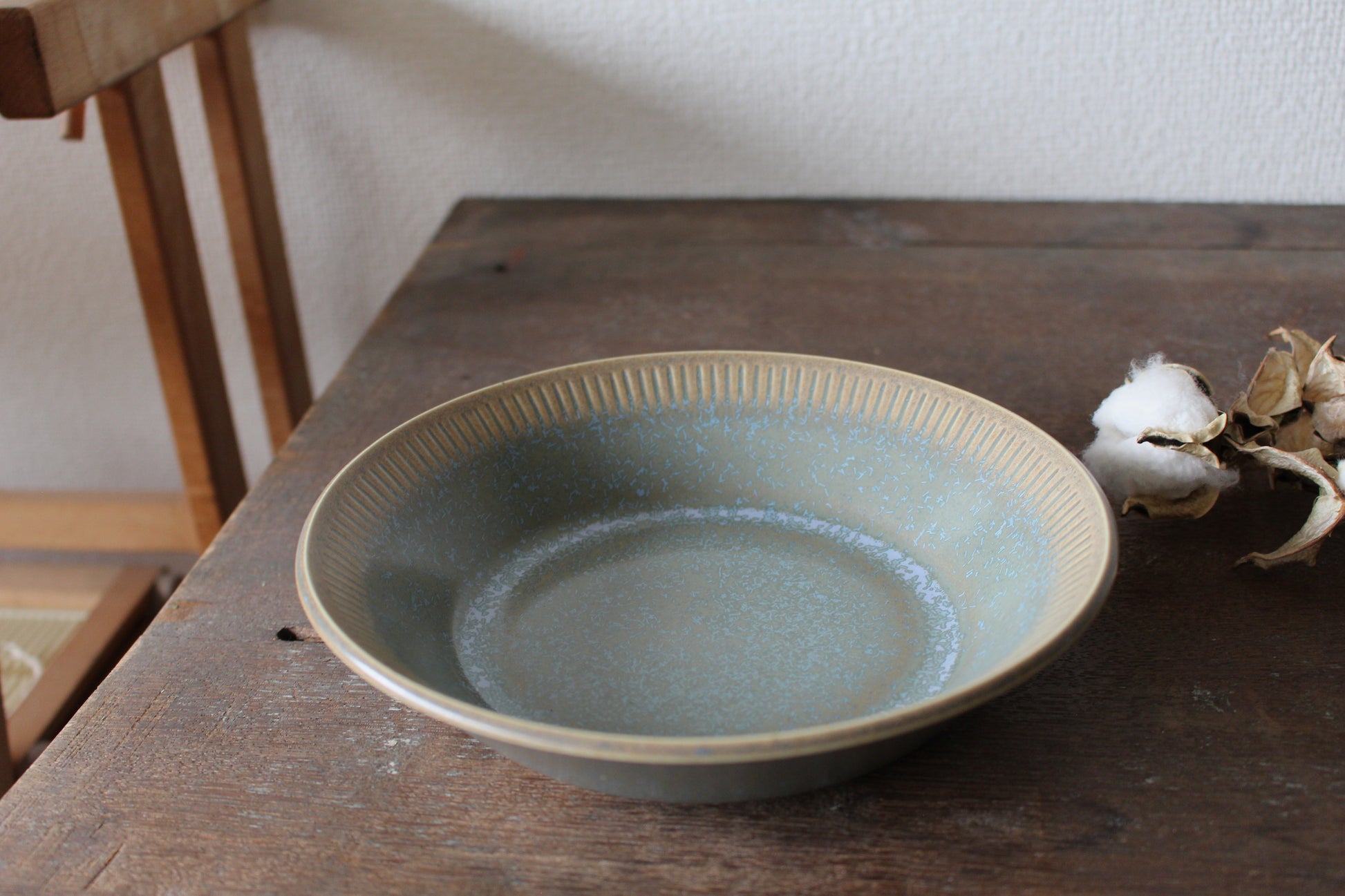 1907年にデンマークで創業されたナブストラップ(Knabstrup)社の、ヌーボー(Nøddebo)というシリーズのボウルです。すっきりしたフォルムに、溶け込むようなベージュとブルーの釉薬のグラデーションがとても美しい製品です。1988年に廃業となり、元々生産数の少ない希少なシリーズですが、このサイズのボウルはさらに珍しいお品です。
