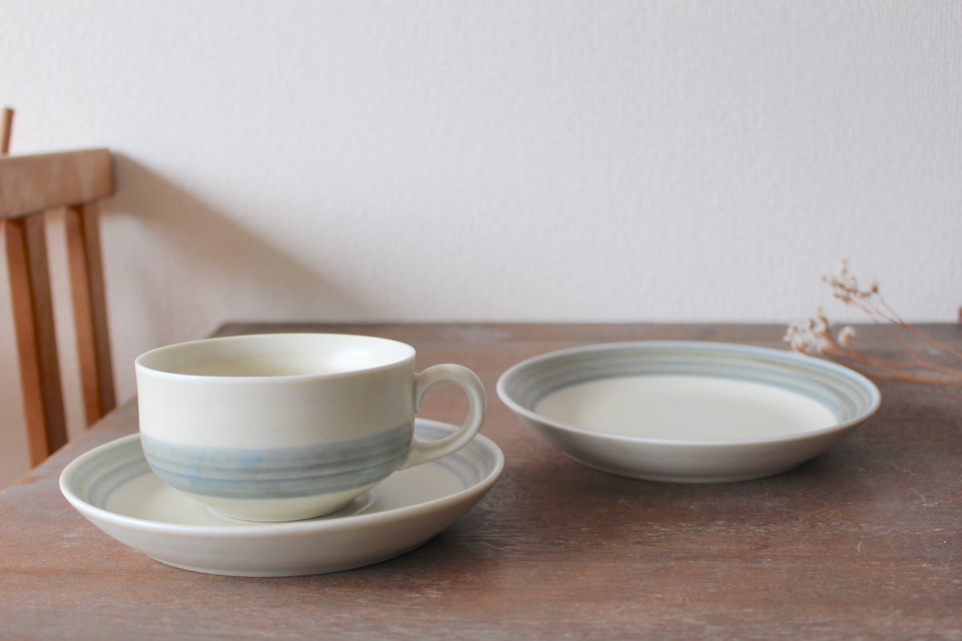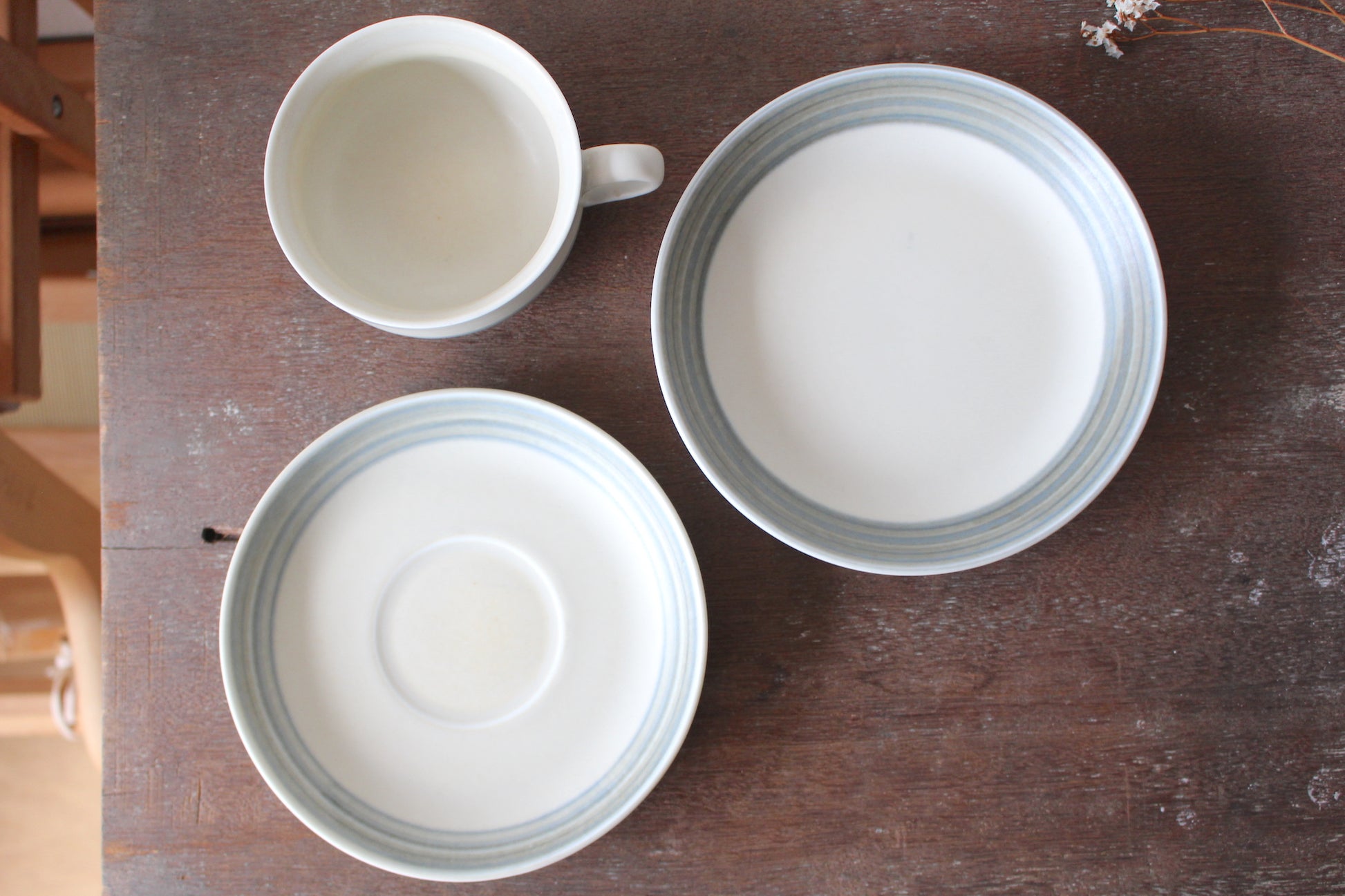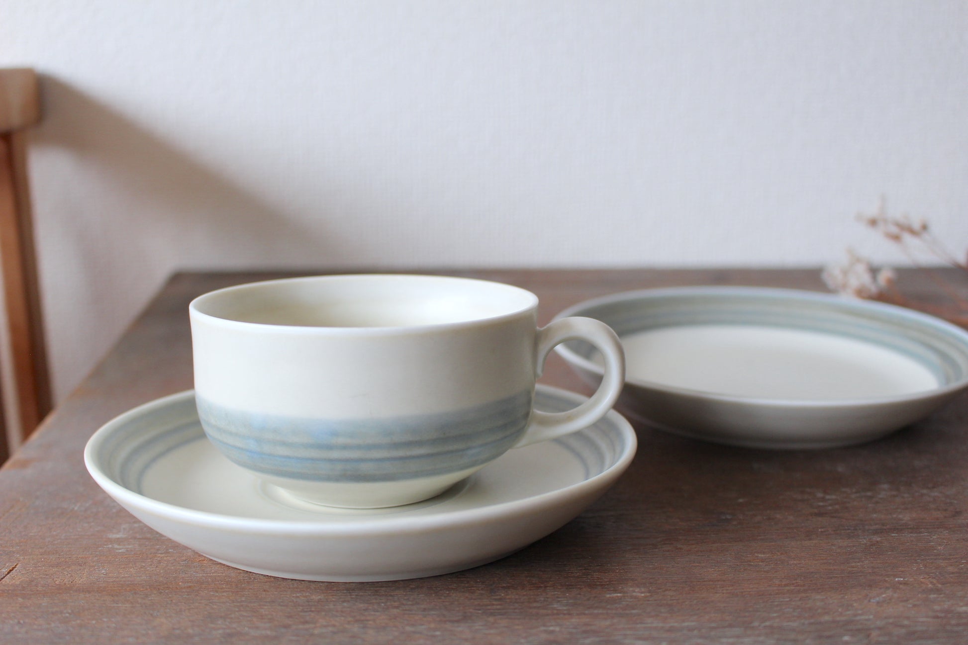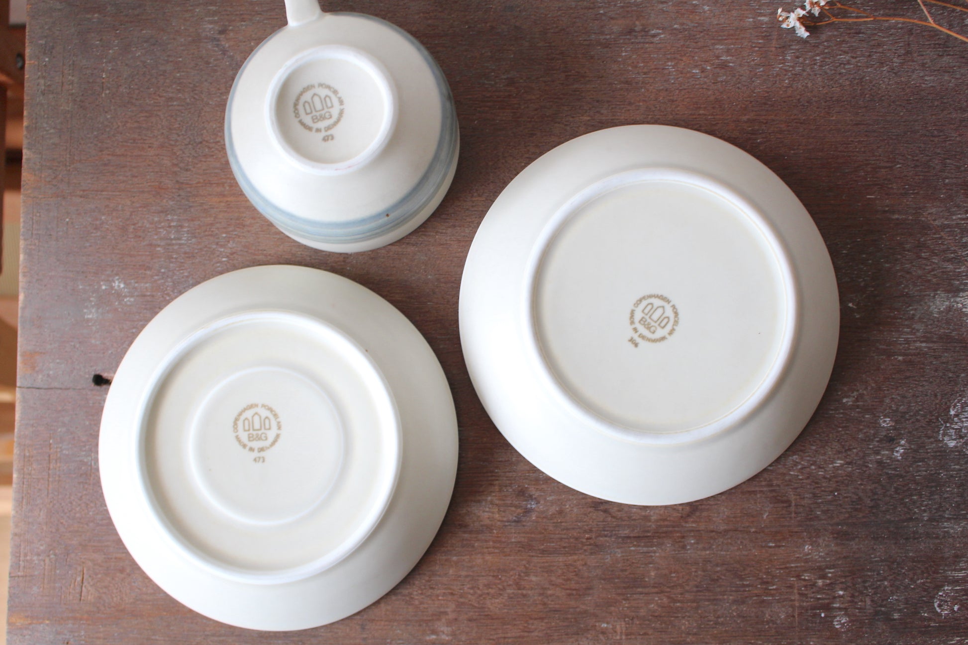エディット・ゾンネ・ブルーン(Edith Sonne Bruun, 1910-1993)がデザインを手がけたカップ、ソーサー 、プレートの3点セットです。ぽってりとしたマットな質感、ブルーグレーのラインがアクセントになったシンプルでモダンなデザインが特徴です。60年代から70年代のものですが生産数が少なく、デンマークでもあまり出回らない希少なシリーズです。