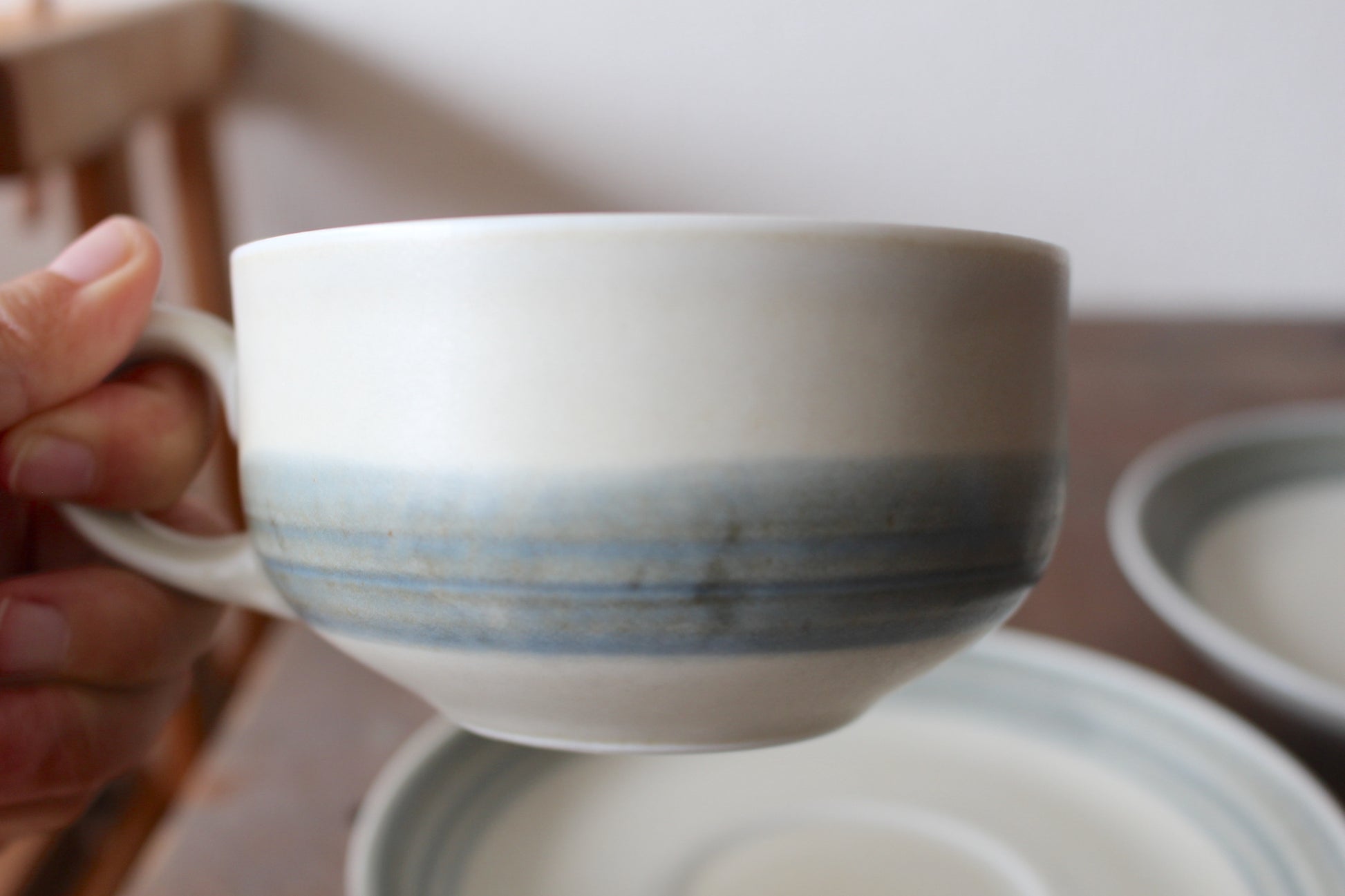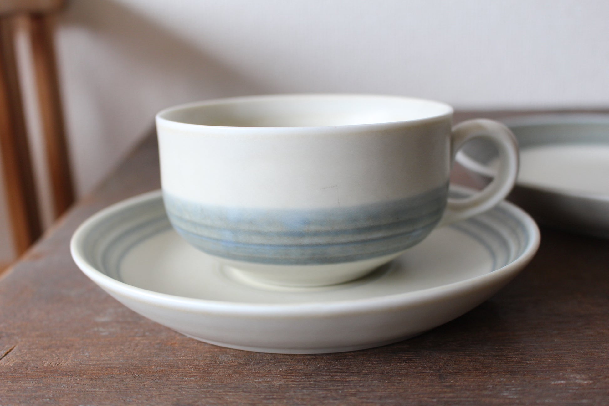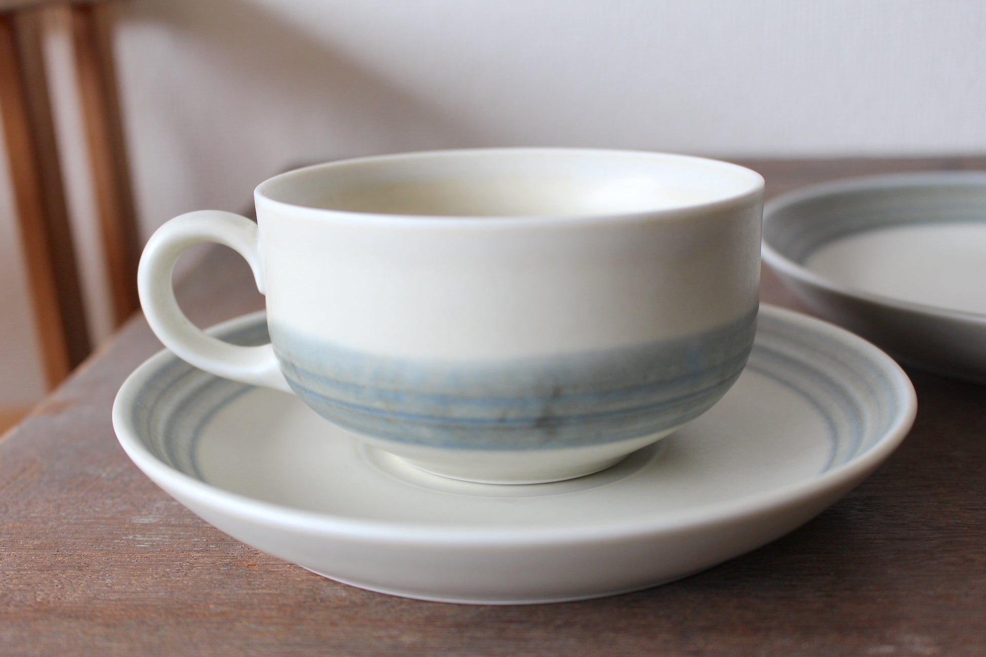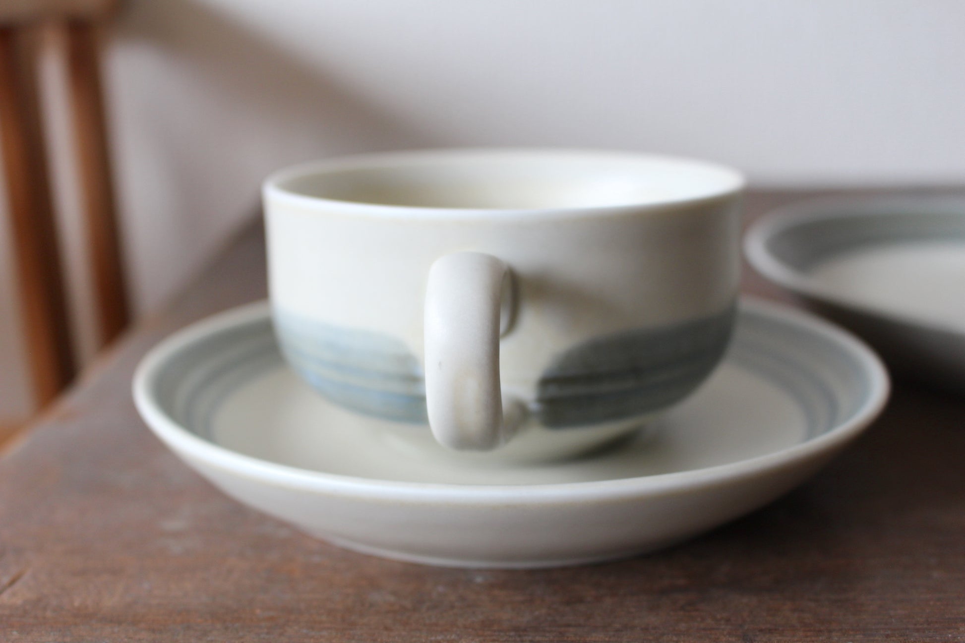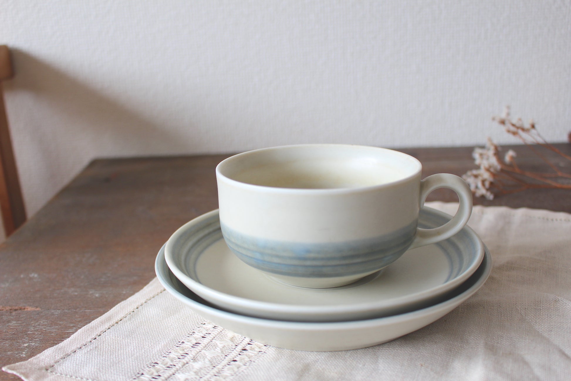 エディット・ゾンネ・ブルーン(Edith Sonne Bruun, 1910-1993)がデザインを手がけたカップ、ソーサー 、プレートの3点セットです。ぽってりとしたマットな質感、ブルーグレーのラインがアクセントになったシンプルでモダンなデザインが特徴です。60年代から70年代のものですが生産数が少なく、デンマークでもあまり出回らない希少なシリーズです。