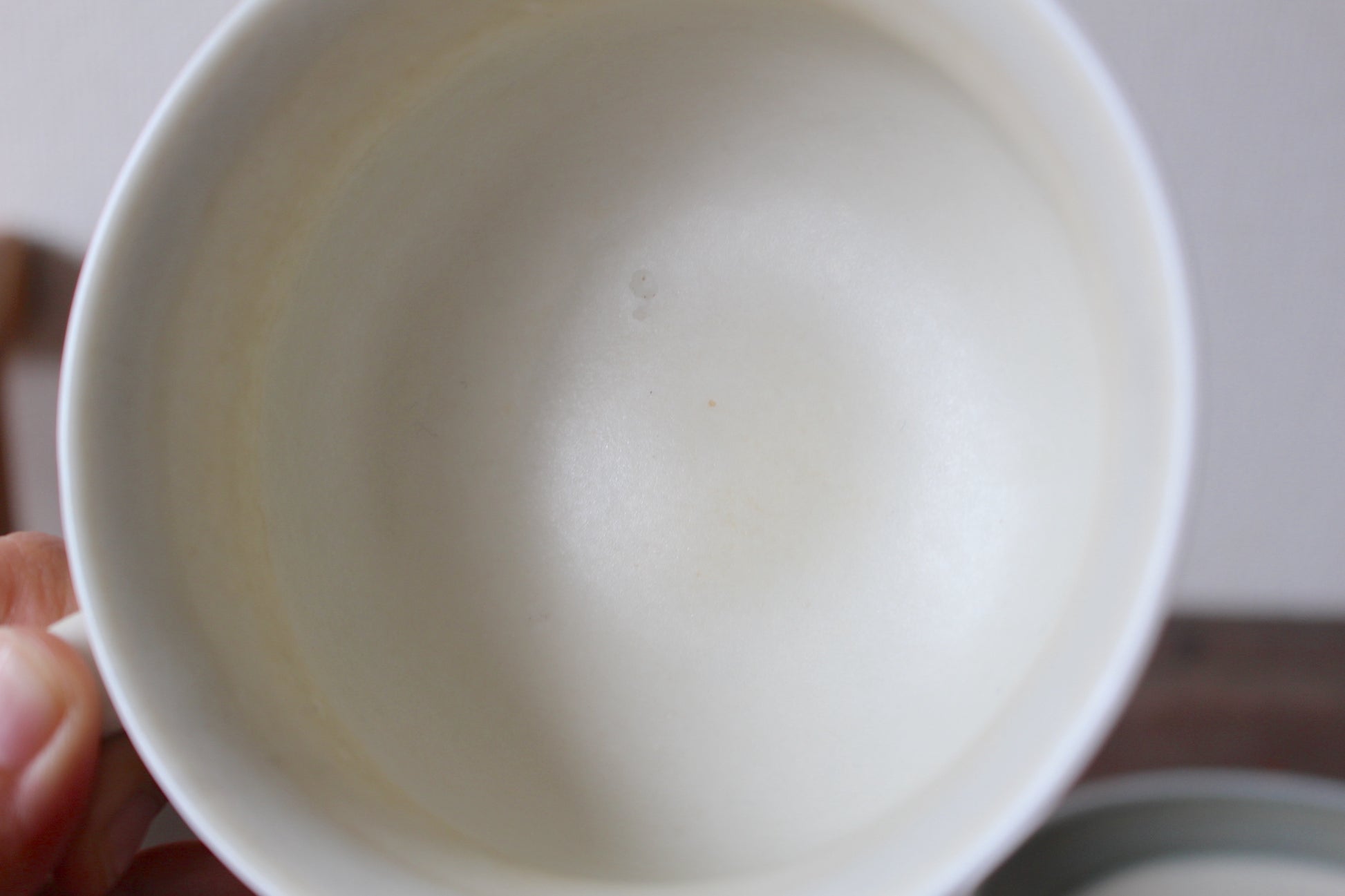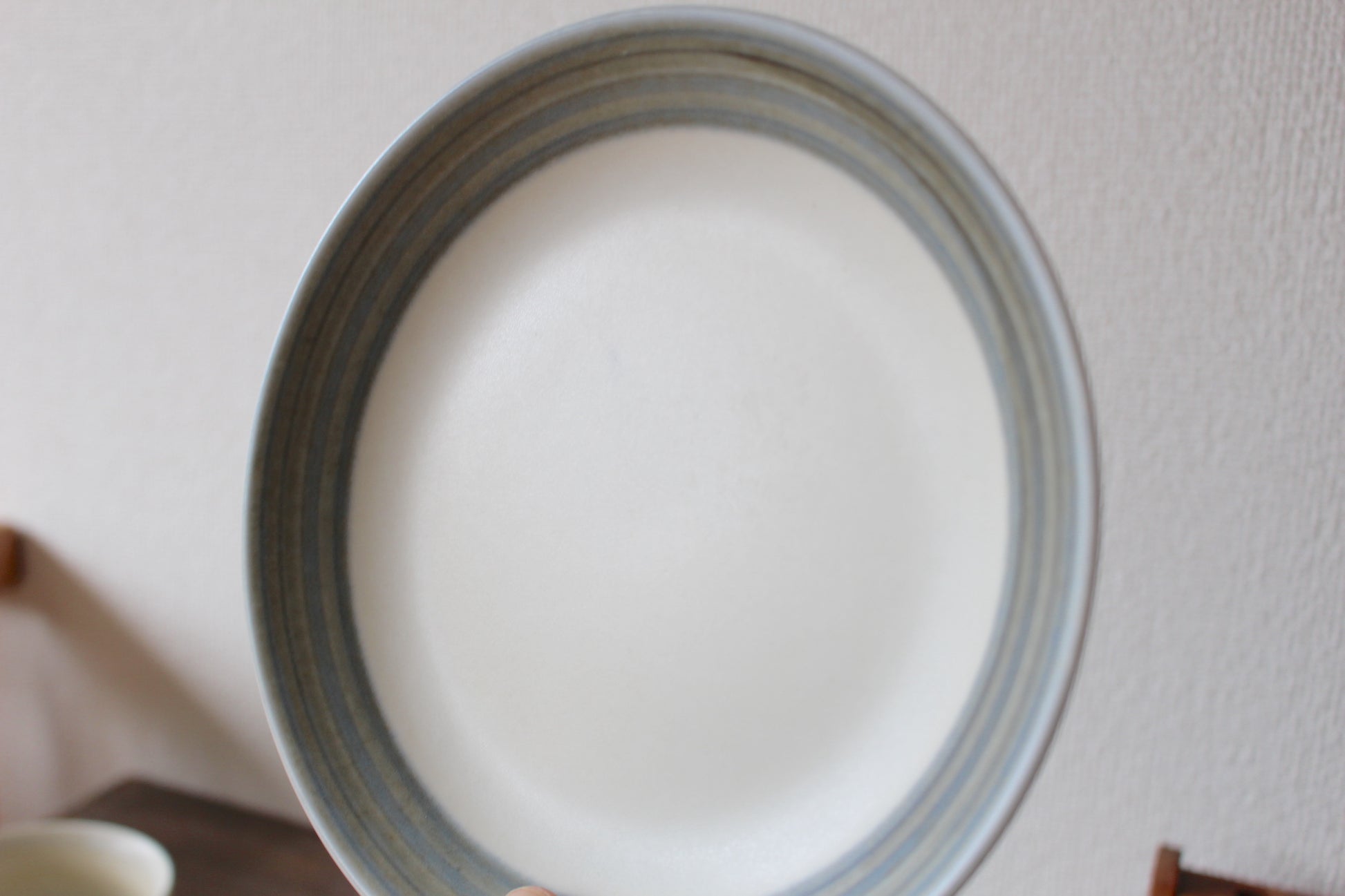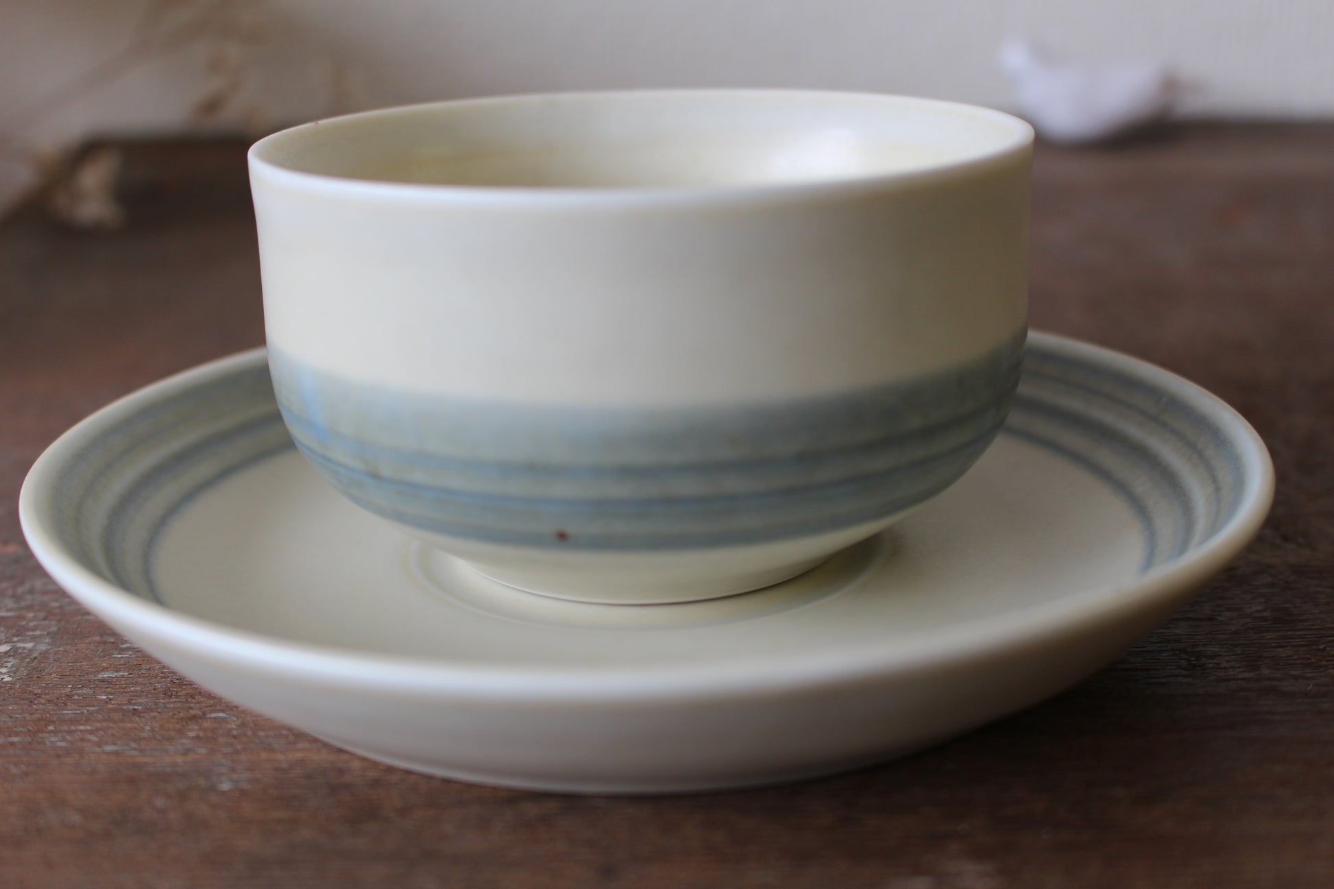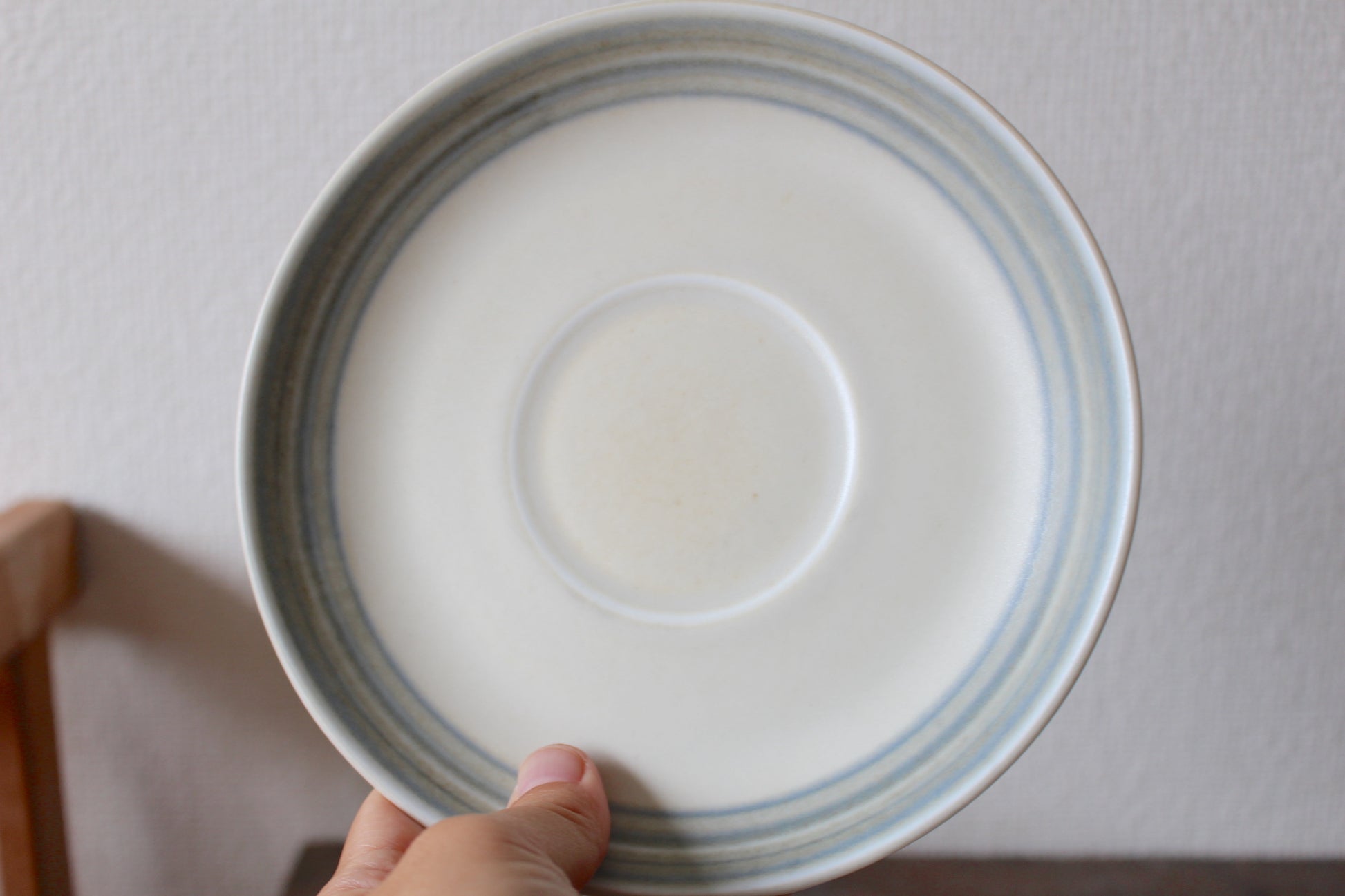 エディット・ゾンネ・ブルーン(Edith Sonne Bruun, 1910-1993)がデザインを手がけたカップ、ソーサー 、プレートの3点セットです。ぽってりとしたマットな質感、ブルーグレーのラインがアクセントになったシンプルでモダンなデザインが特徴です。60年代から70年代のものですが生産数が少なく、デンマークでもあまり出回らない希少なシリーズです。