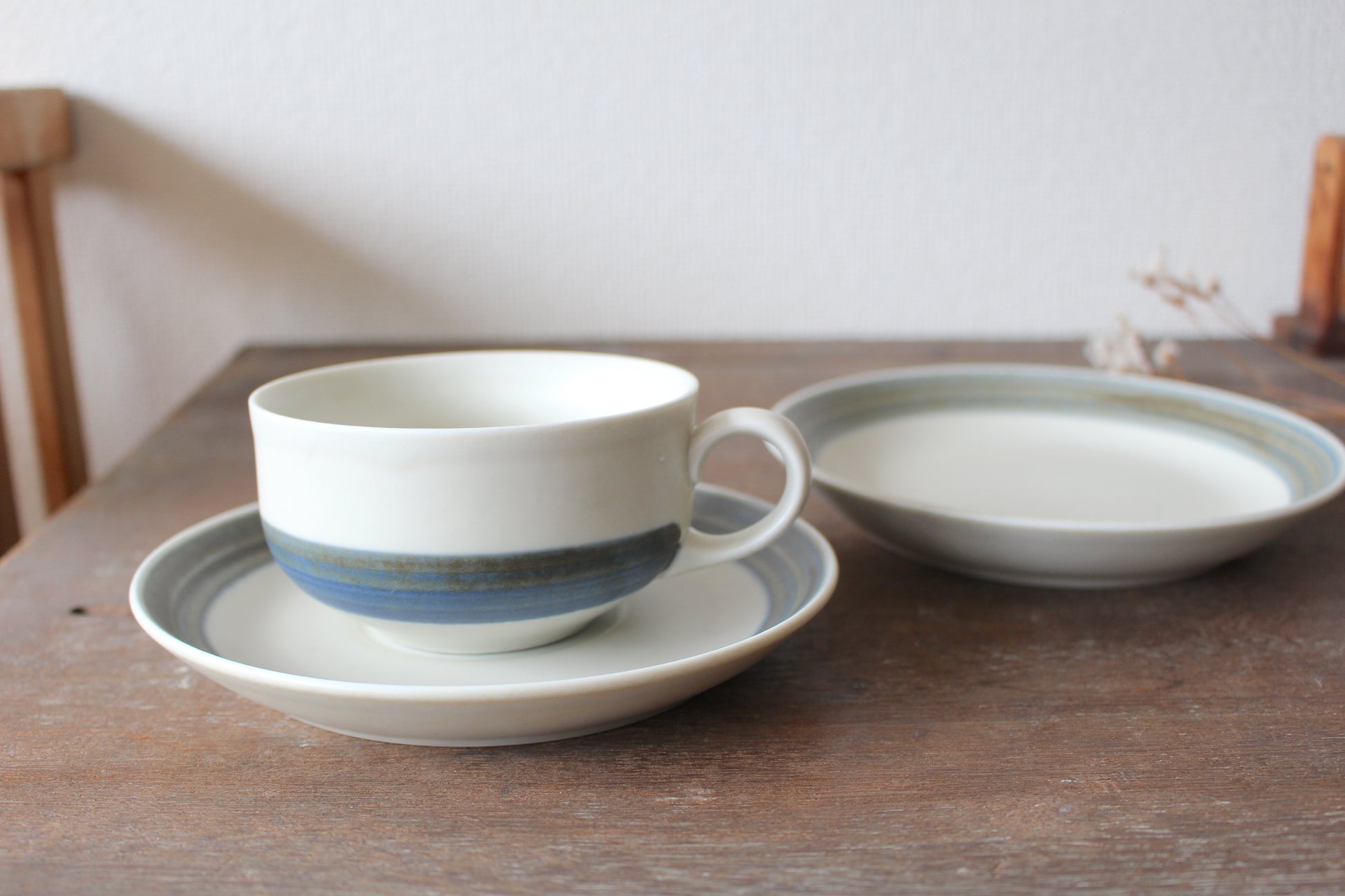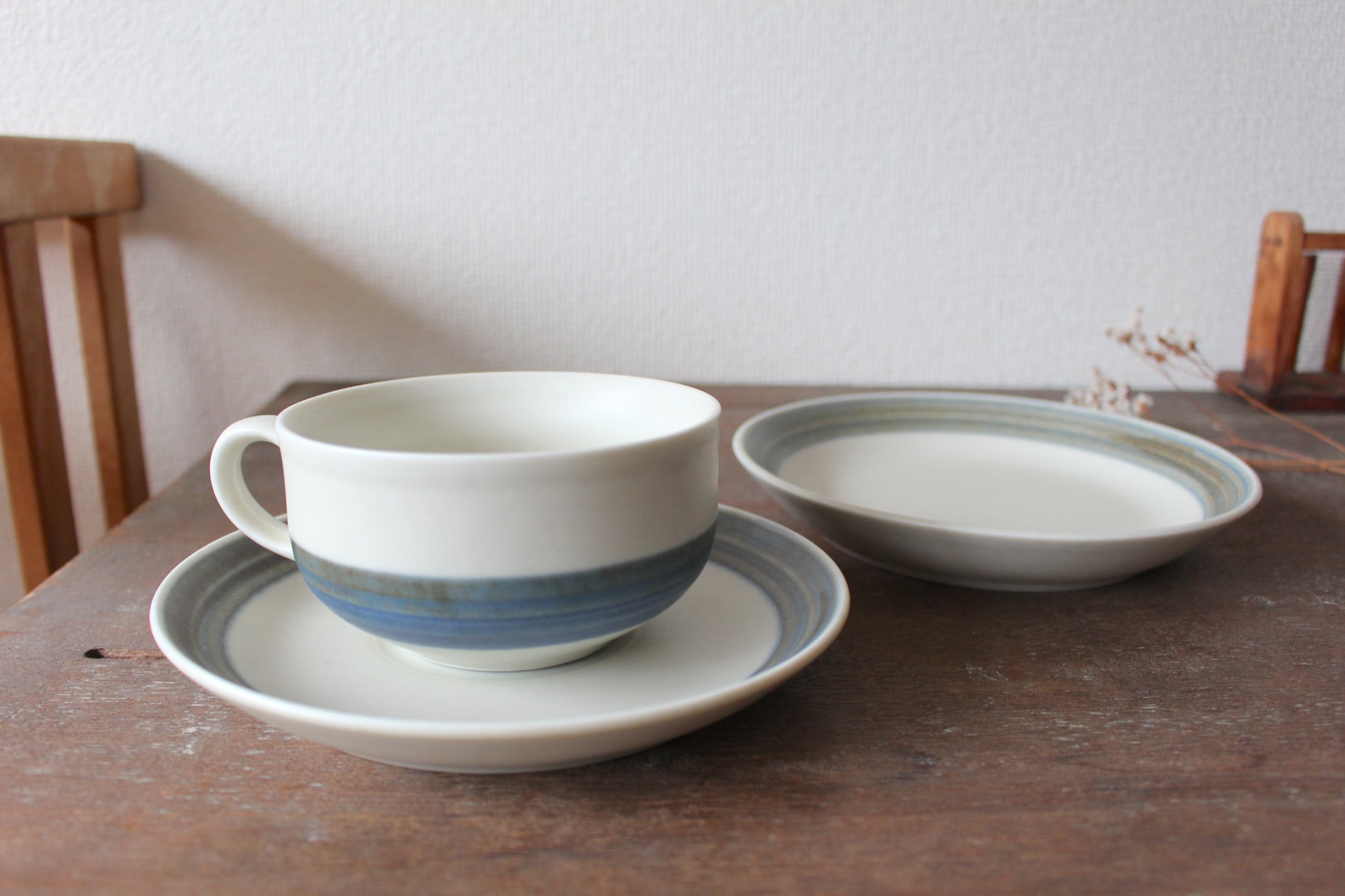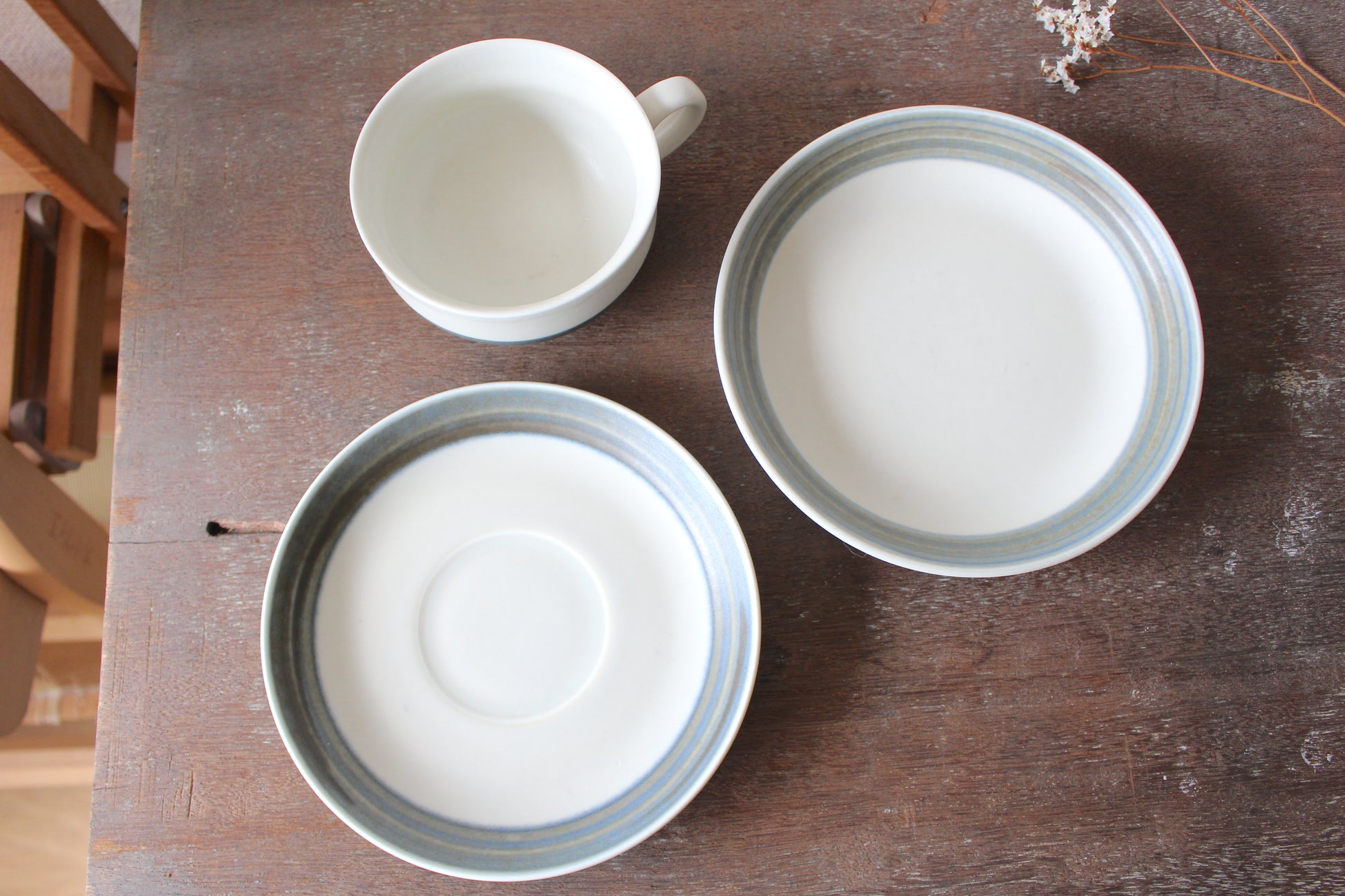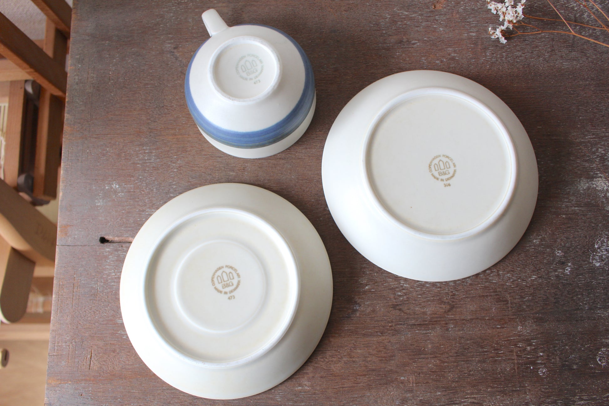 エディット・ゾンネ・ブルーン(Edith Sonne Bruun, 1910-1993)がデザインを手がけたカップ、ソーサー 、プレートの3点セットです。ぽってりとしたマットな質感、ブルーグレーのラインがアクセントになったシンプルでモダンなデザインが特徴です。60年代から70年代のものですが生産数が少なく、デンマークでもあまり出回らない希少なシリーズです。