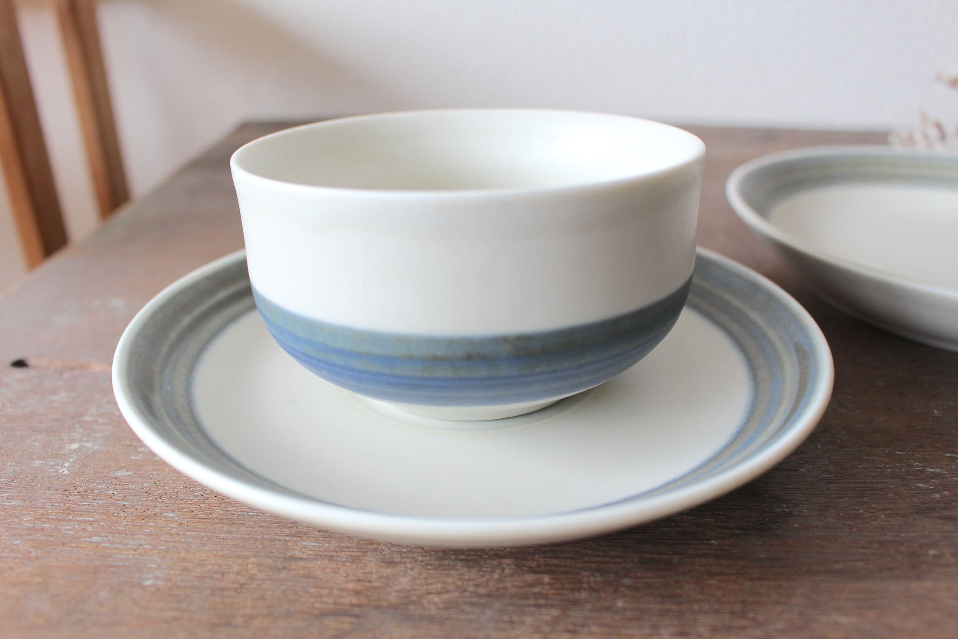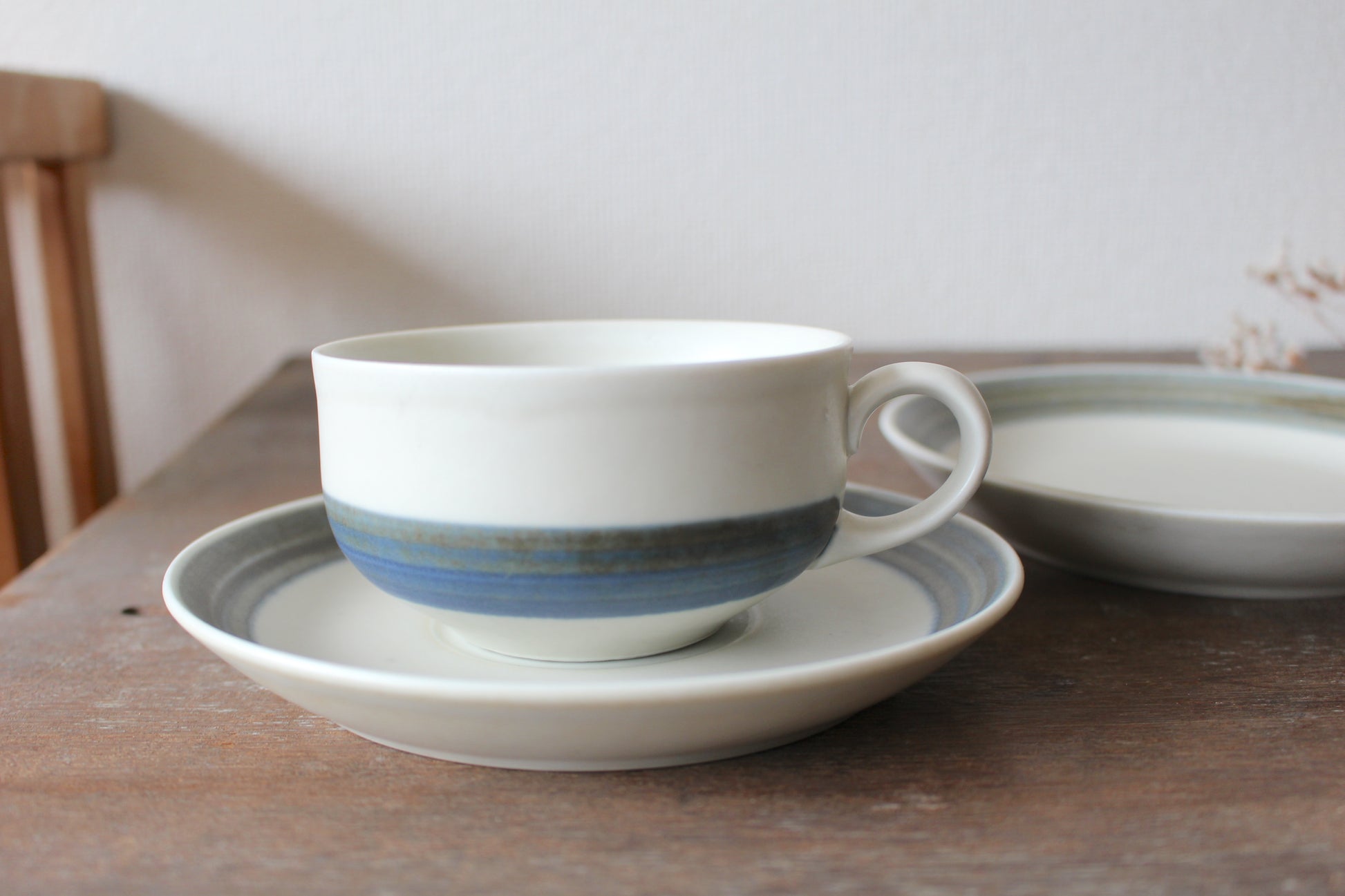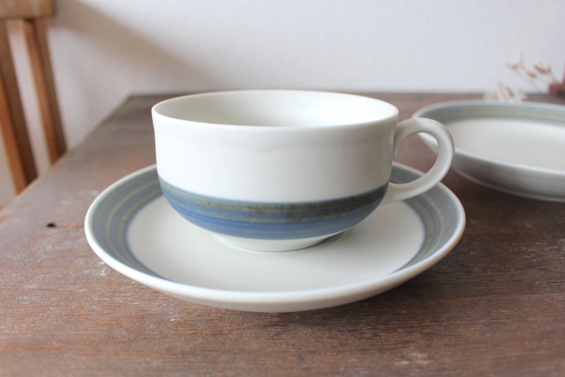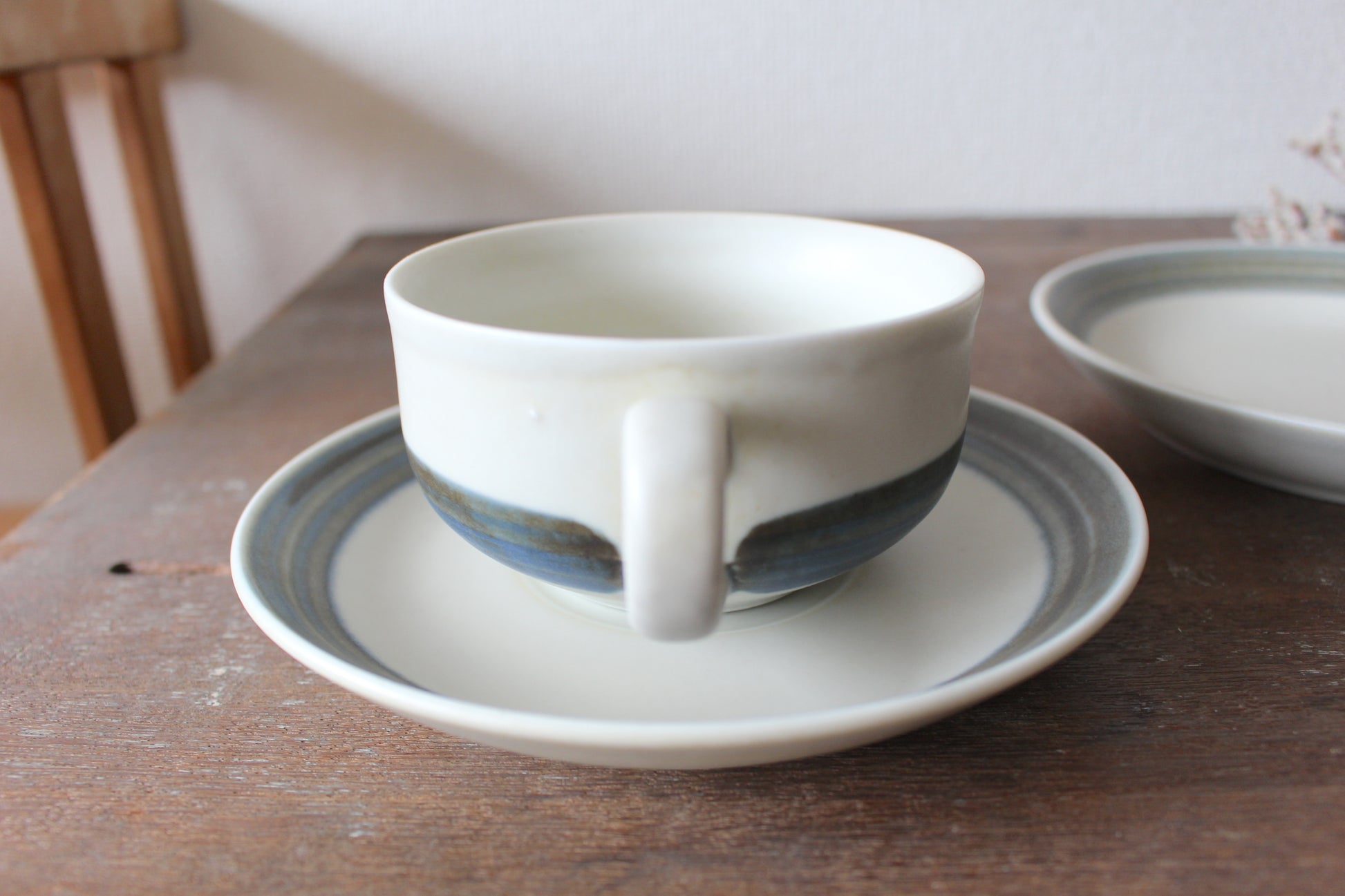 エディット・ゾンネ・ブルーン(Edith Sonne Bruun, 1910-1993)がデザインを手がけたカップ、ソーサー 、プレートの3点セットです。ぽってりとしたマットな質感、ブルーグレーのラインがアクセントになったシンプルでモダンなデザインが特徴です。60年代から70年代のものですが生産数が少なく、デンマークでもあまり出回らない希少なシリーズです。