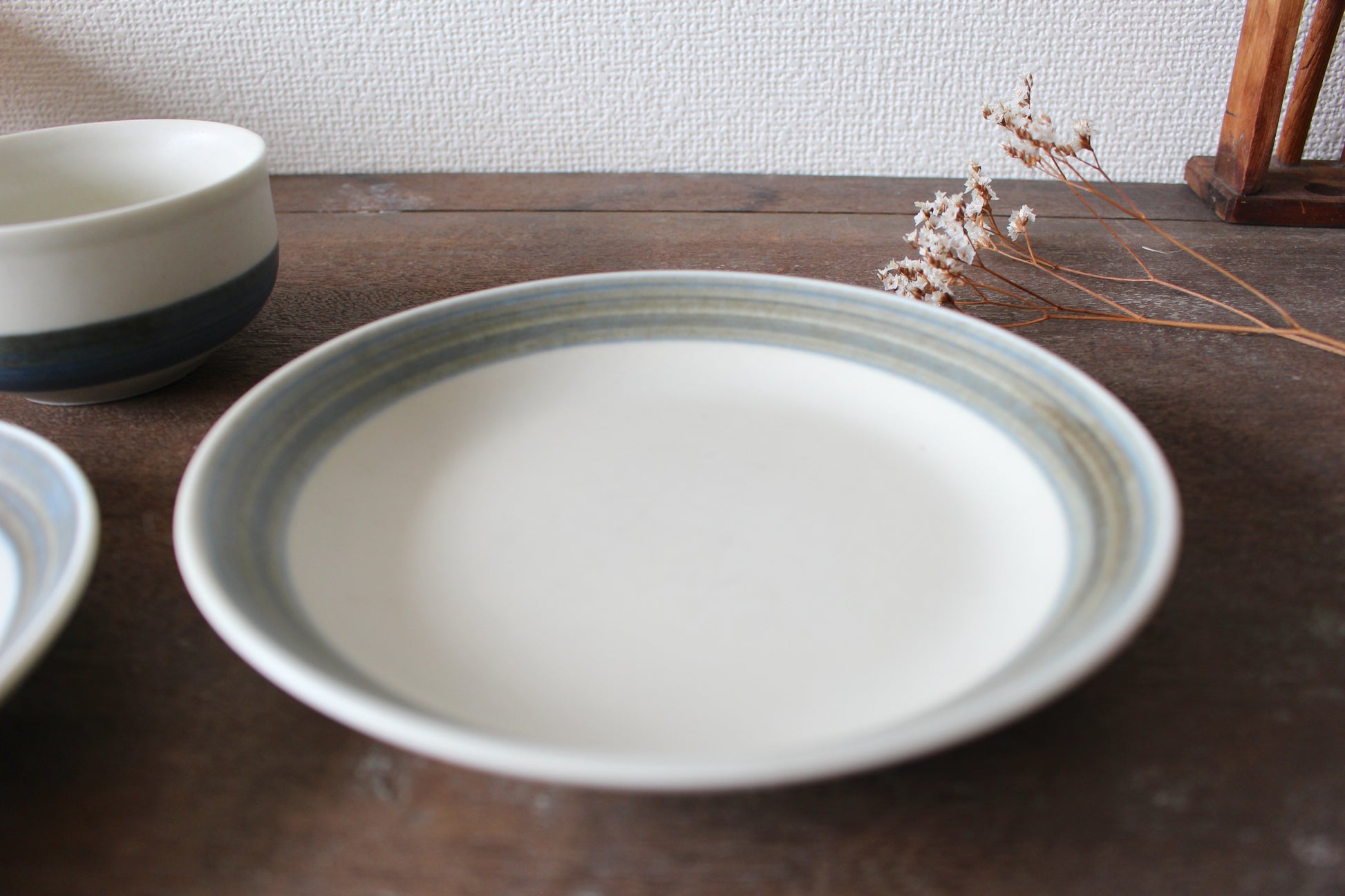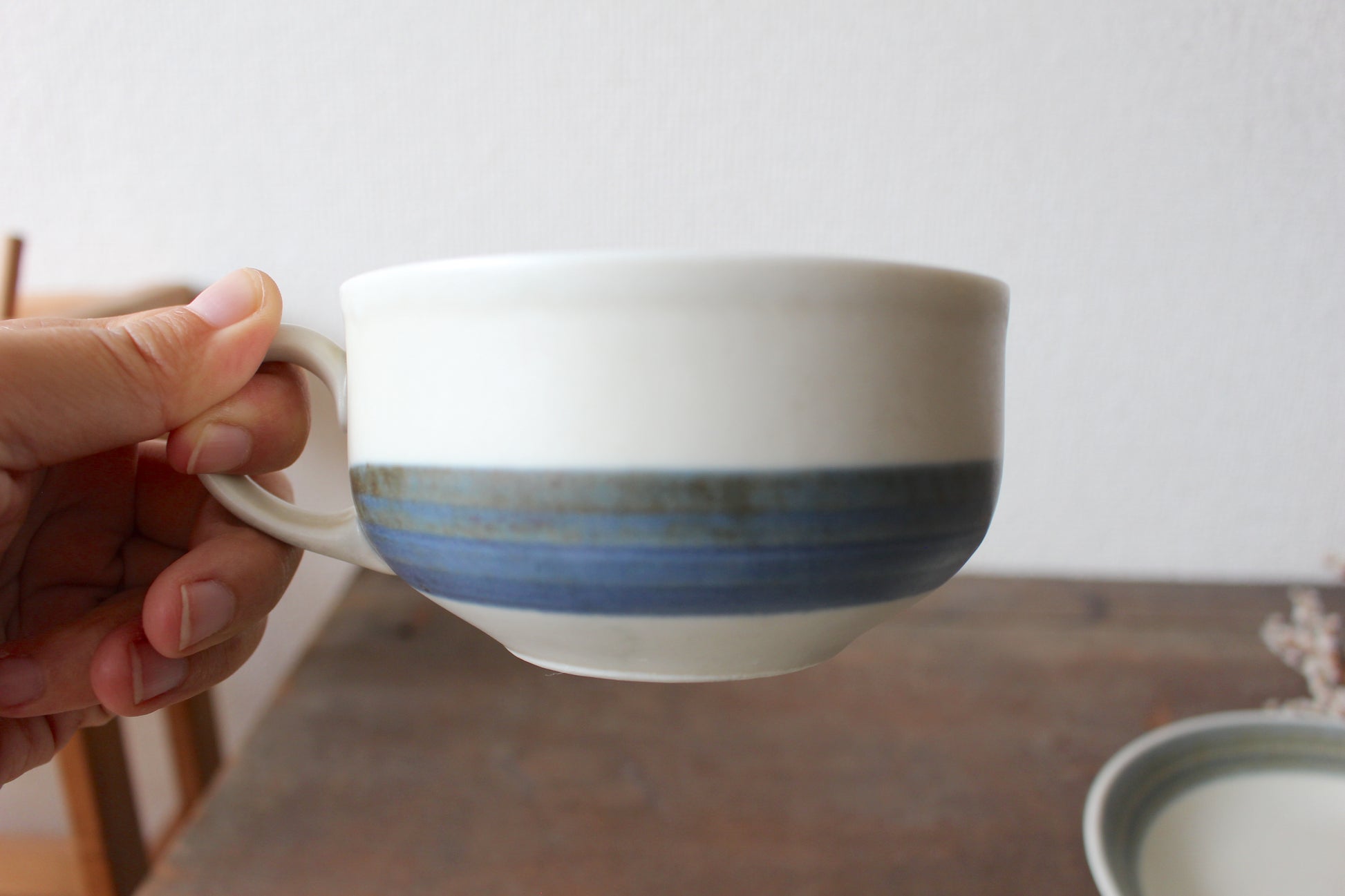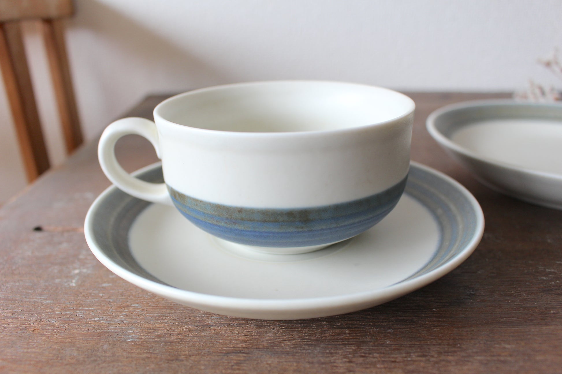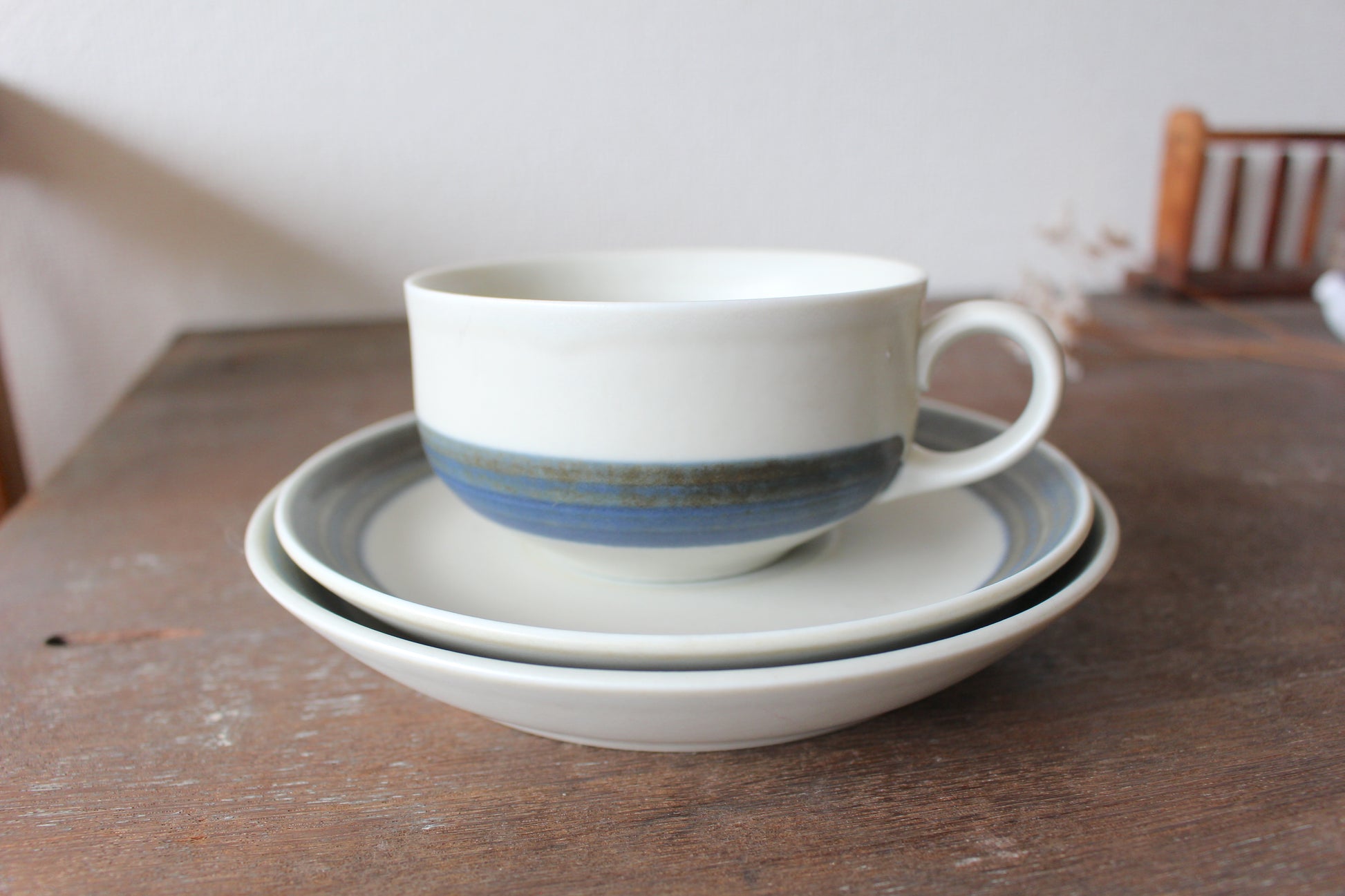 エディット・ゾンネ・ブルーン(Edith Sonne Bruun, 1910-1993)がデザインを手がけたカップ、ソーサー 、プレートの3点セットです。ぽってりとしたマットな質感、ブルーグレーのラインがアクセントになったシンプルでモダンなデザインが特徴です。60年代から70年代のものですが生産数が少なく、デンマークでもあまり出回らない希少なシリーズです。