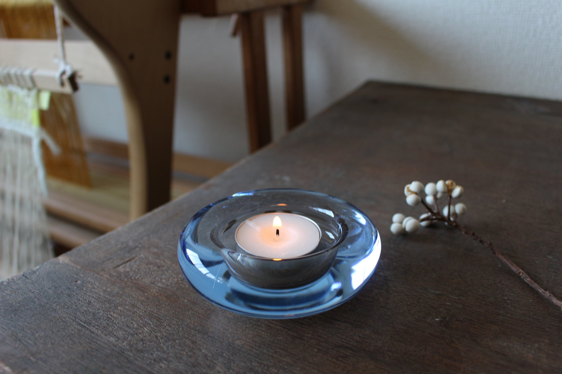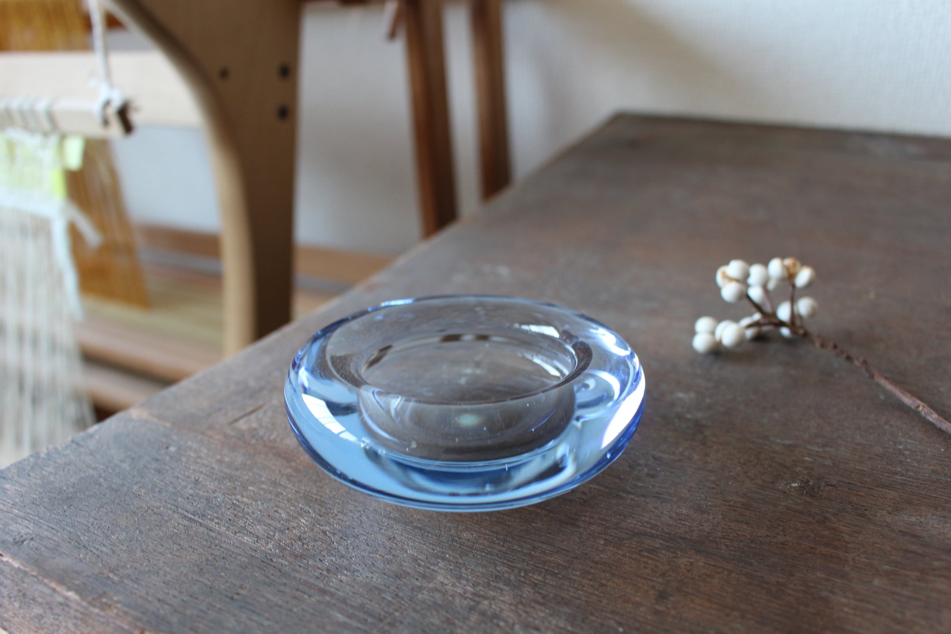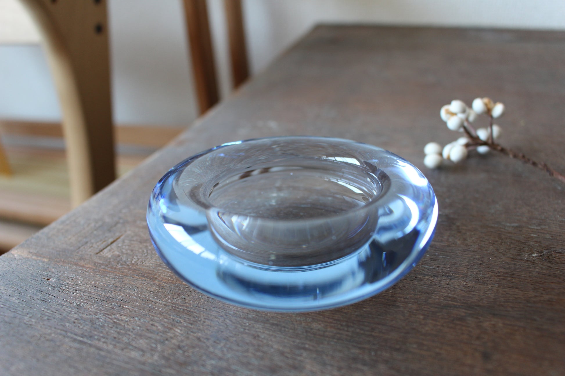 1825年設立以来、デンマーク王室御用達ブランドとして、今でも多くの花瓶やグラスを生産しているホルムガード。こちらはヴィンテージ品でキャンドルホルダー/トレイです。少し分厚めのぷっくりしたフォルムと、淡いブルーの色合いがとても可愛らしく、キャンドルを入れて灯りを灯すととても幻想的です。