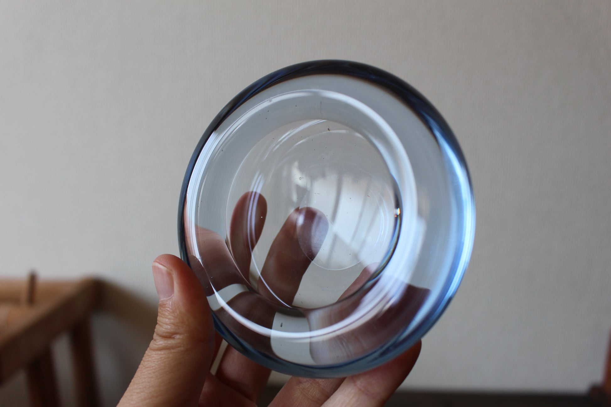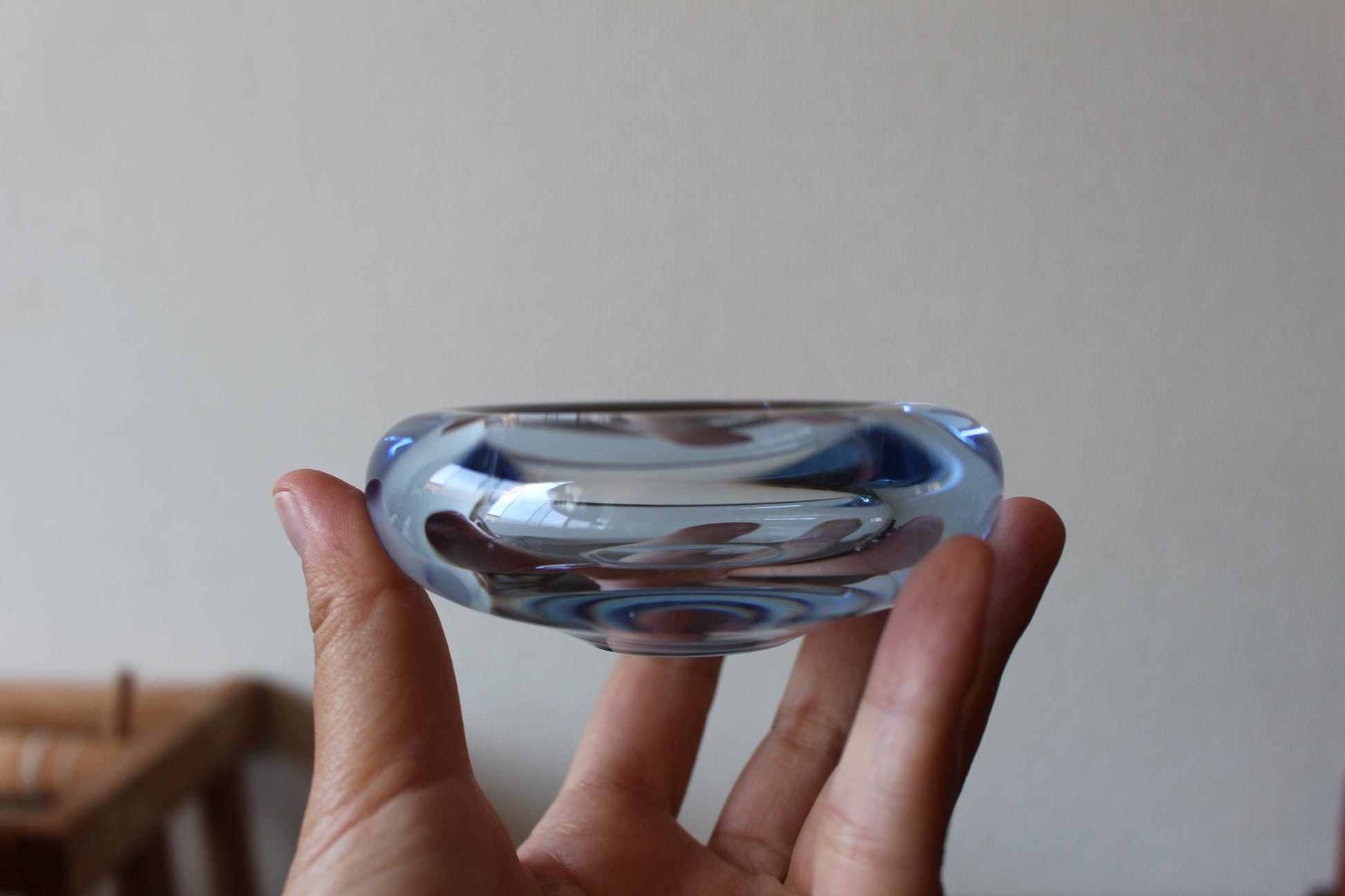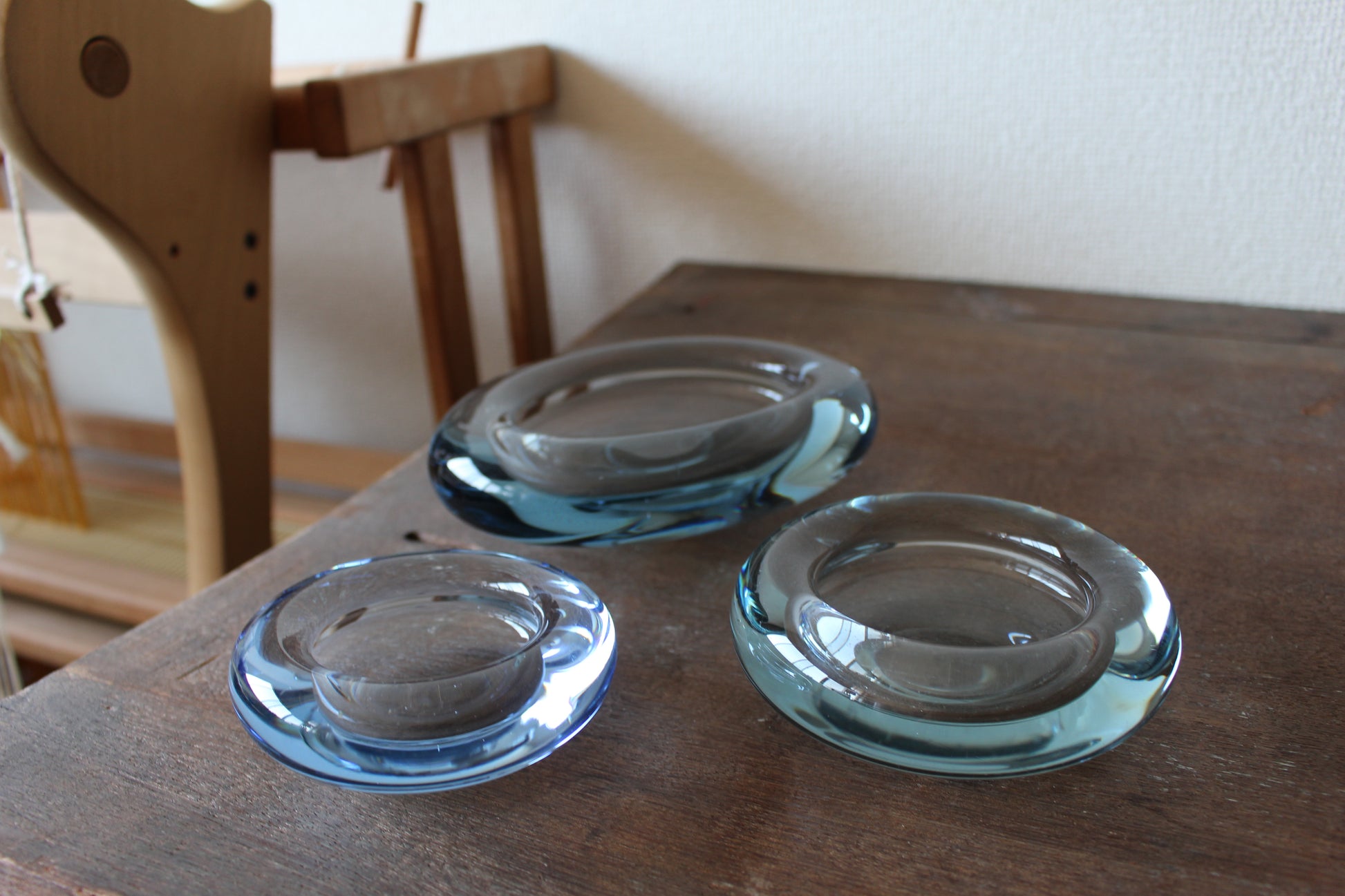 1825年設立以来、デンマーク王室御用達ブランドとして、今でも多くの花瓶やグラスを生産しているホルムガード。こちらはヴィンテージ品でキャンドルホルダー/トレイです。少し分厚めのぷっくりしたフォルムと、淡いブルーの色合いがとても可愛らしく、キャンドルを入れて灯りを灯すととても幻想的です。