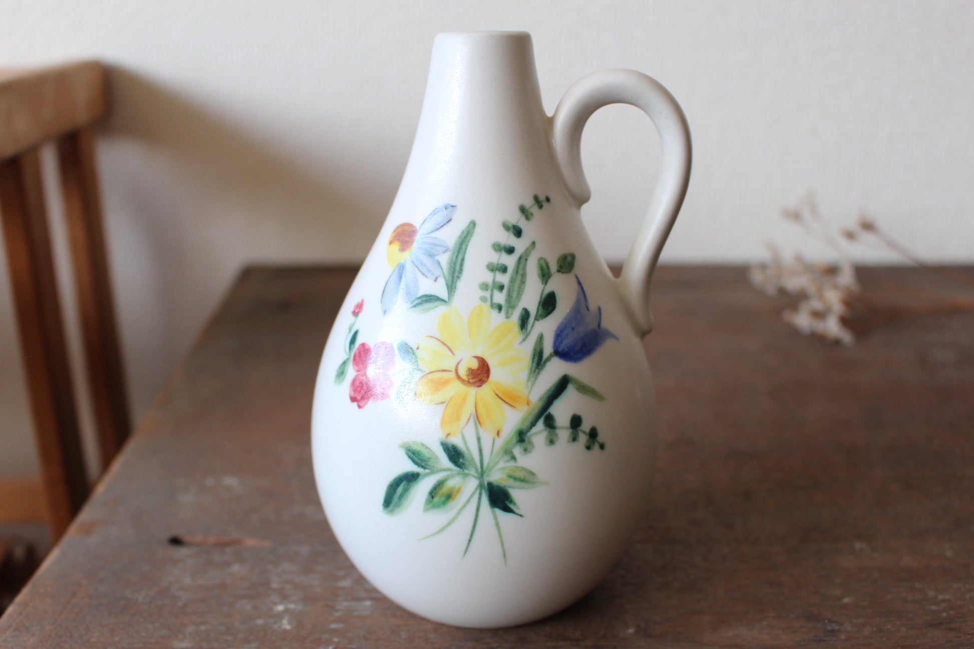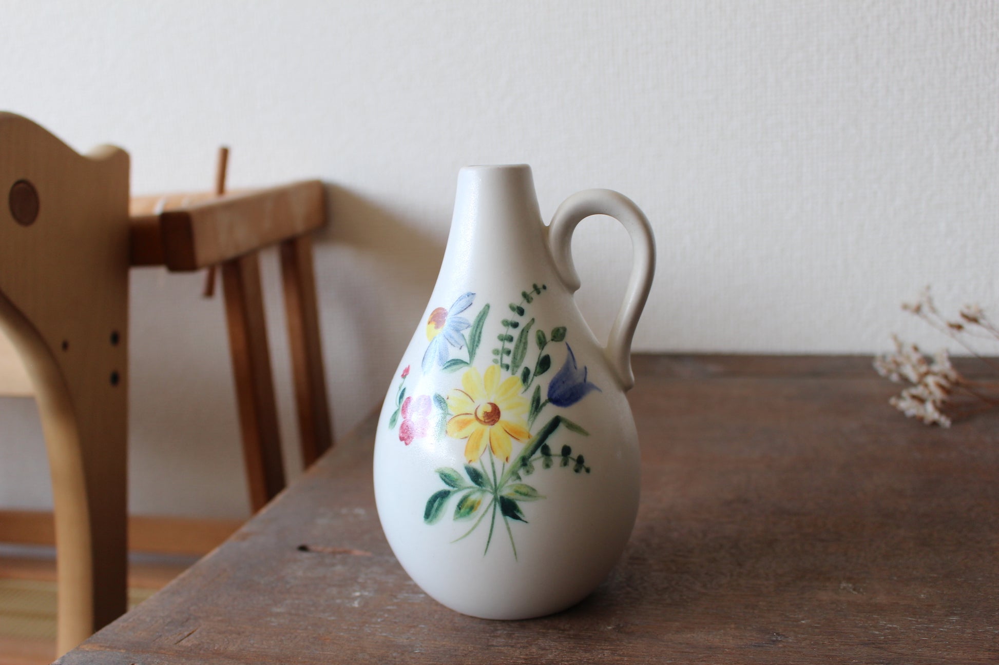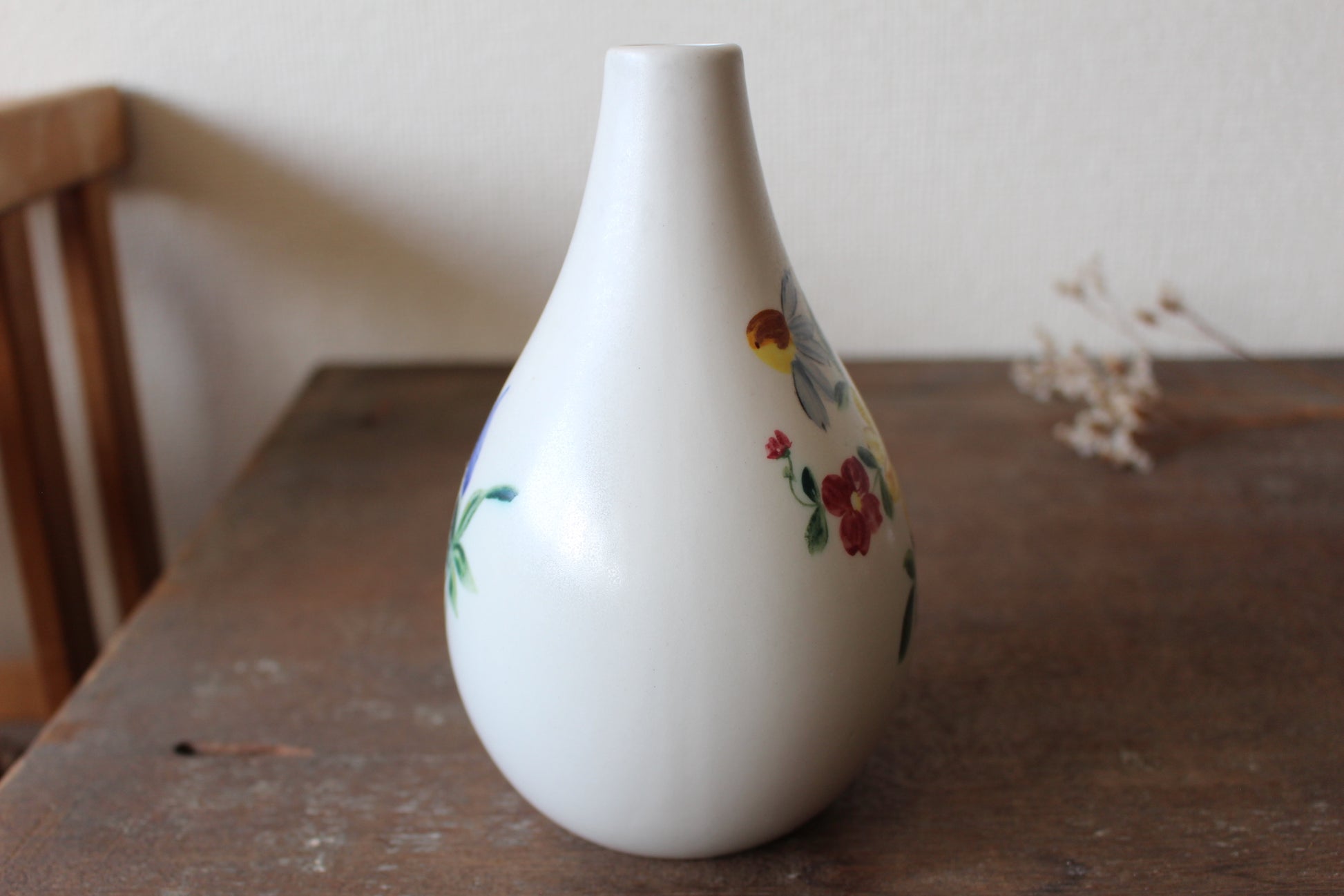 ロースルトランドのstudioで製造されたフラワーベースです。丸みのある美しいフォルムに、手描きで野花が描かれた優しい雰囲気の花瓶です。