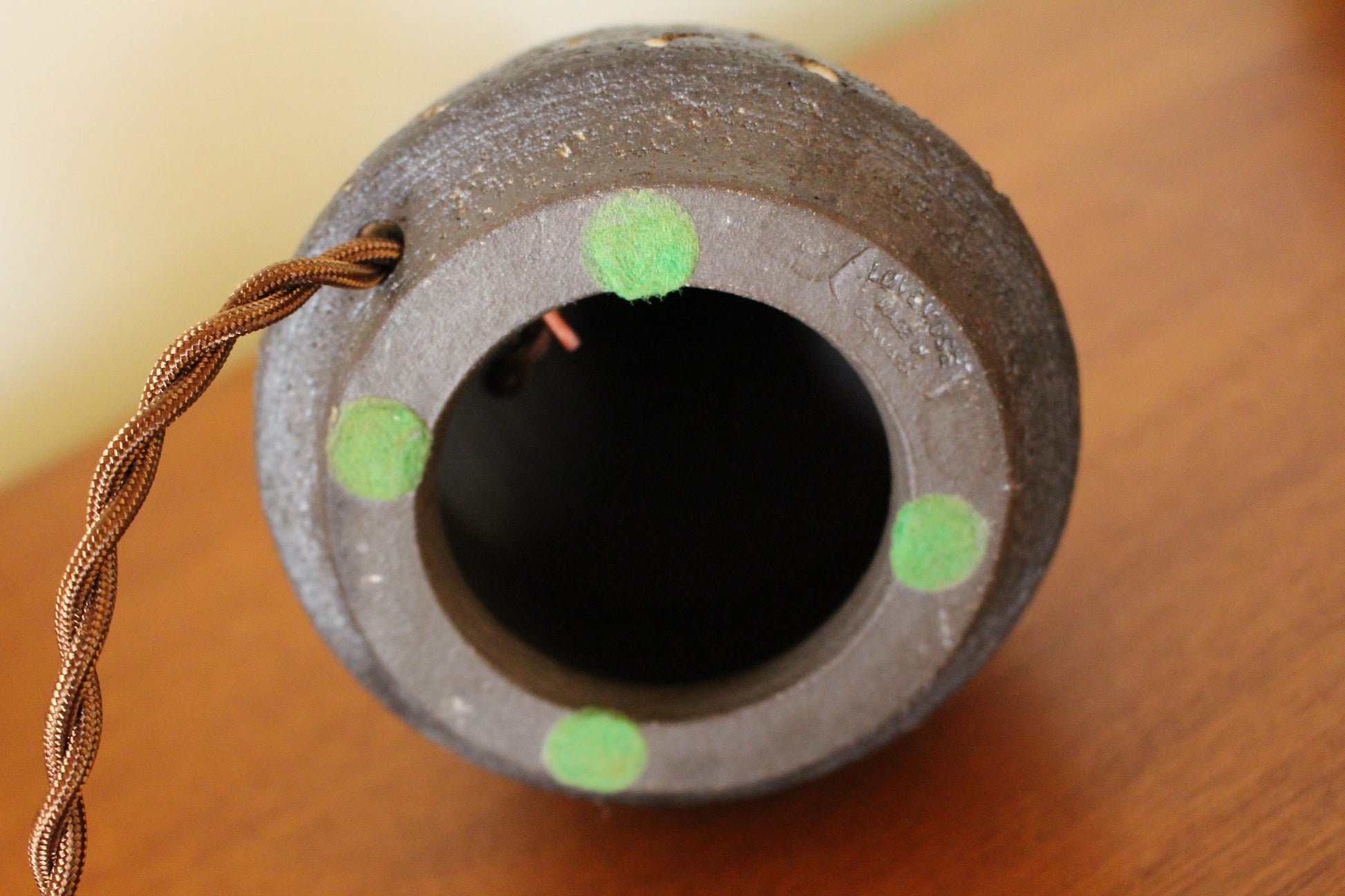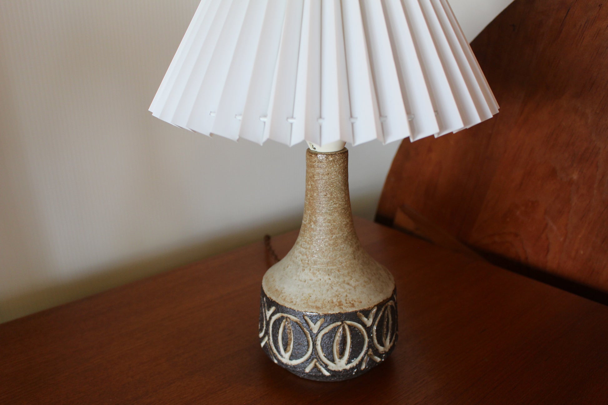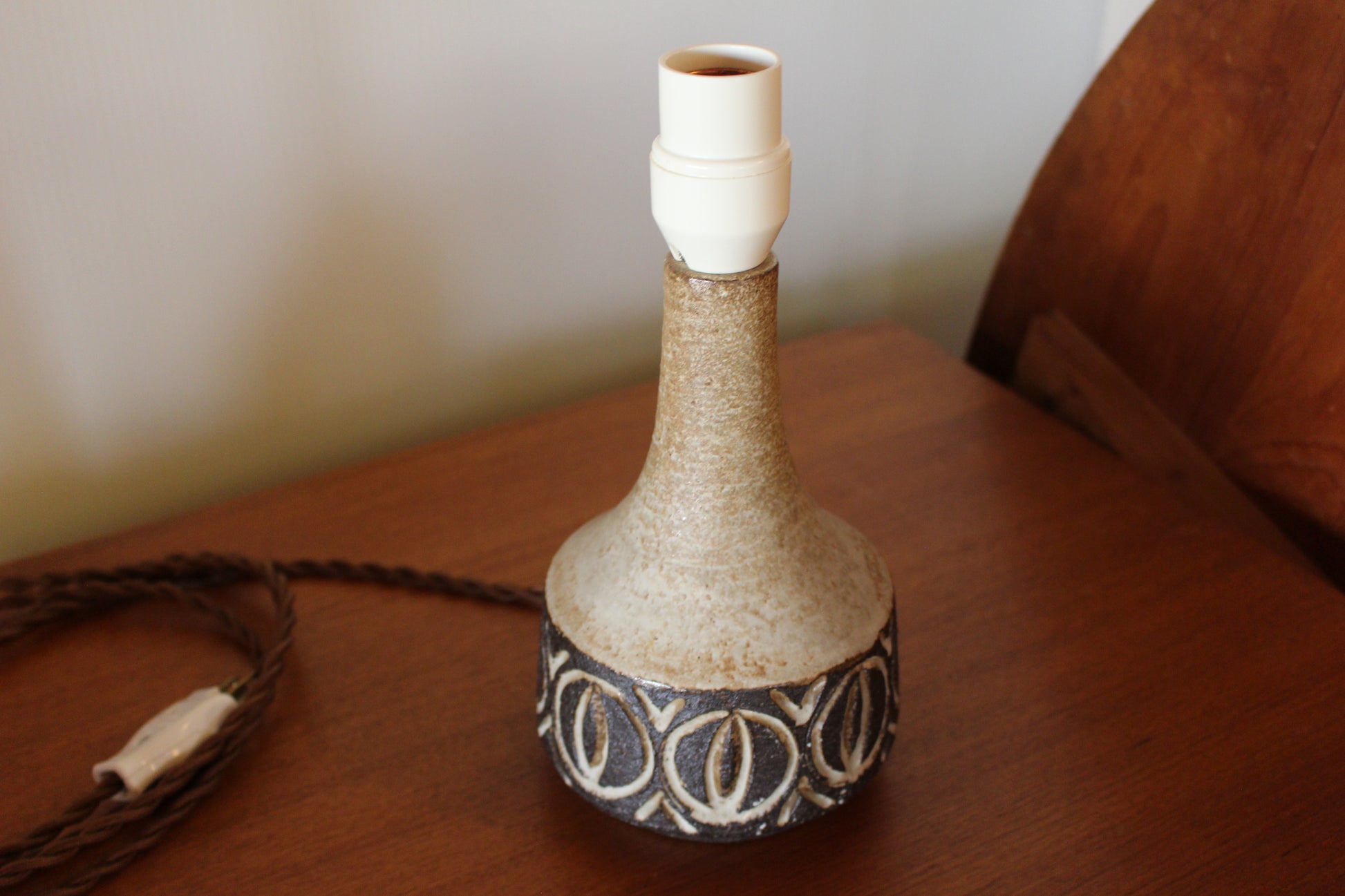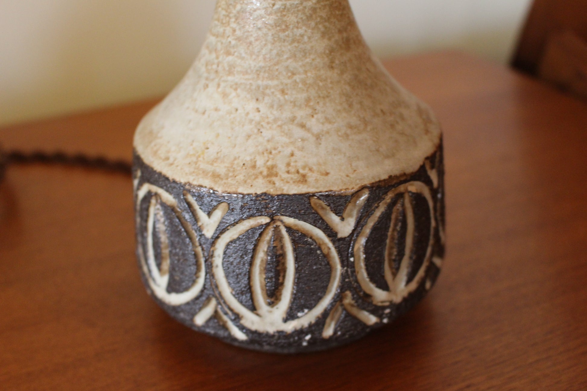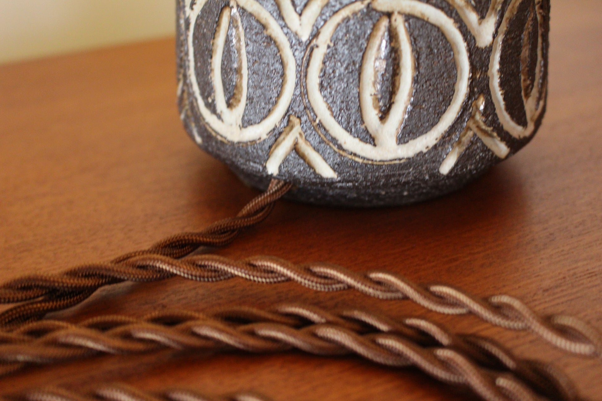 食器が多いロウエモーズですが、こちらは珍しいランプです。落ち着いたブラウンに大胆な彫刻のような模様が刻まれ、シンプルですが存在感のあるランプです。