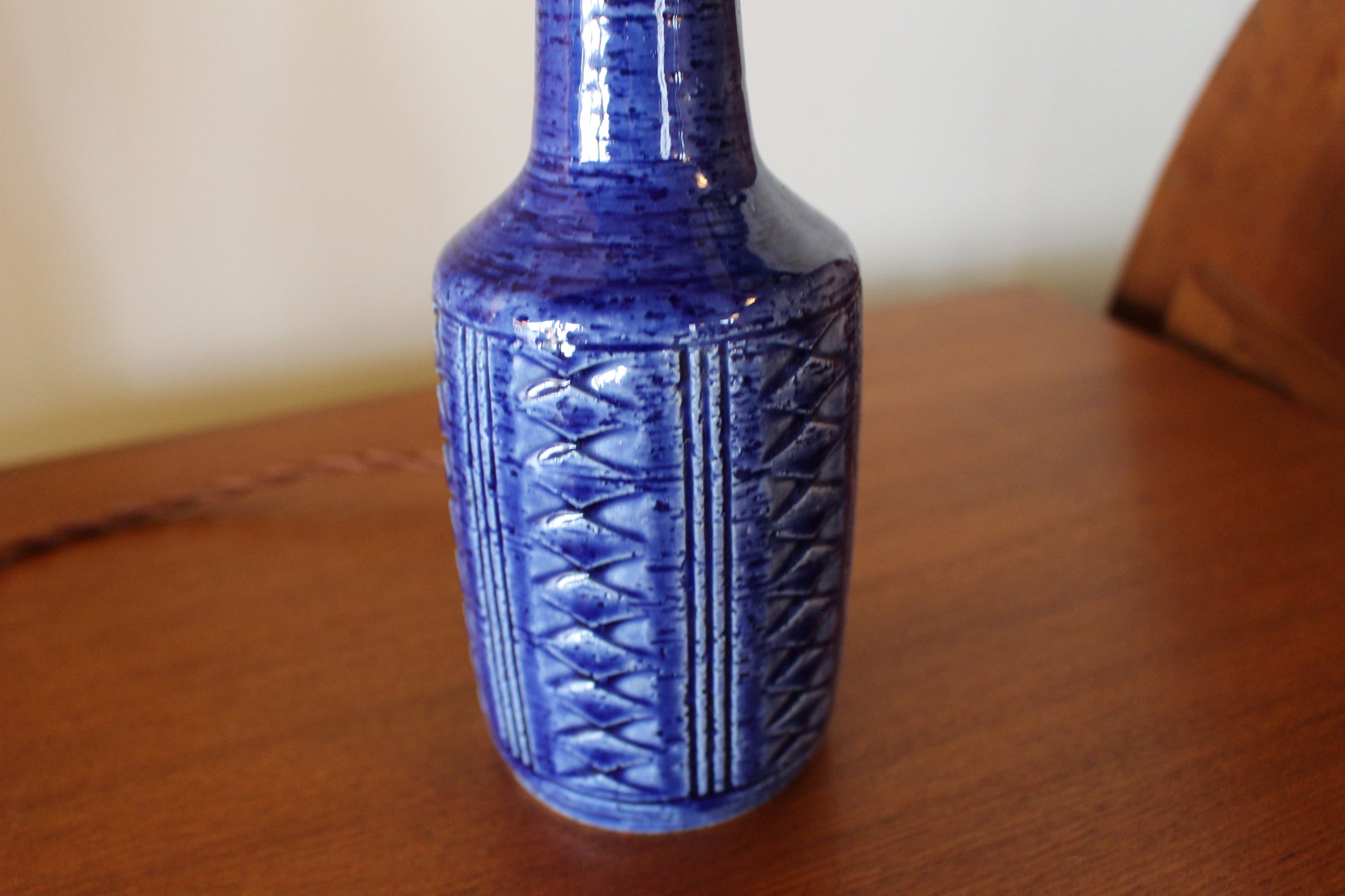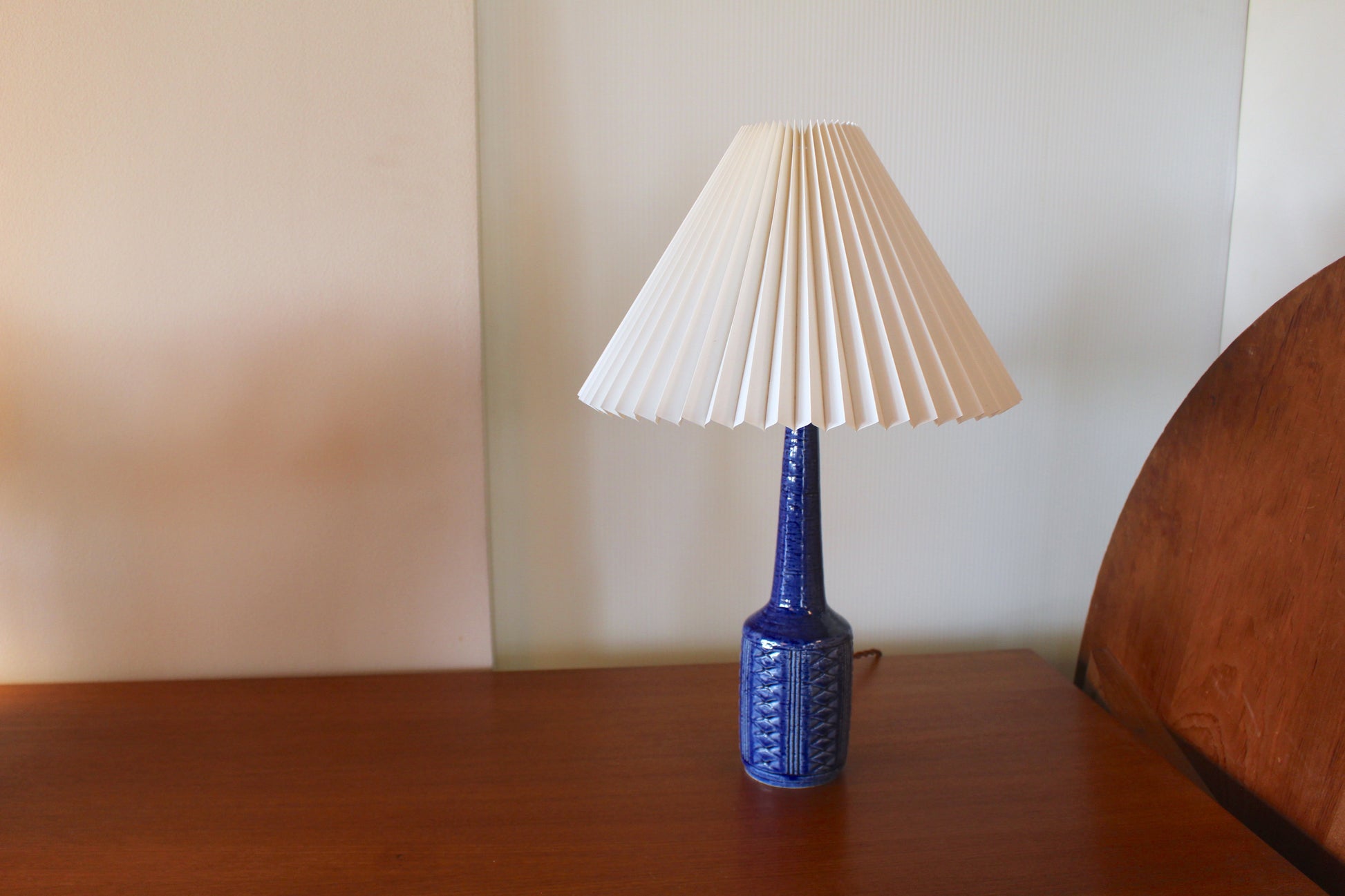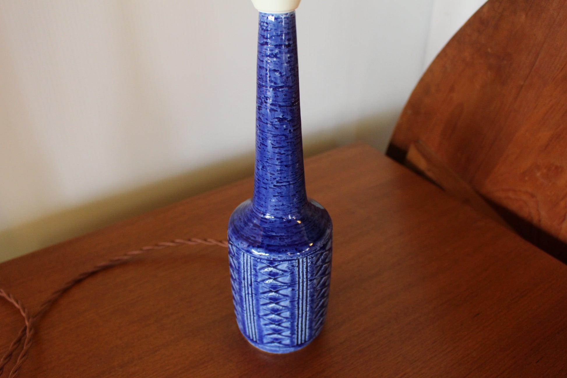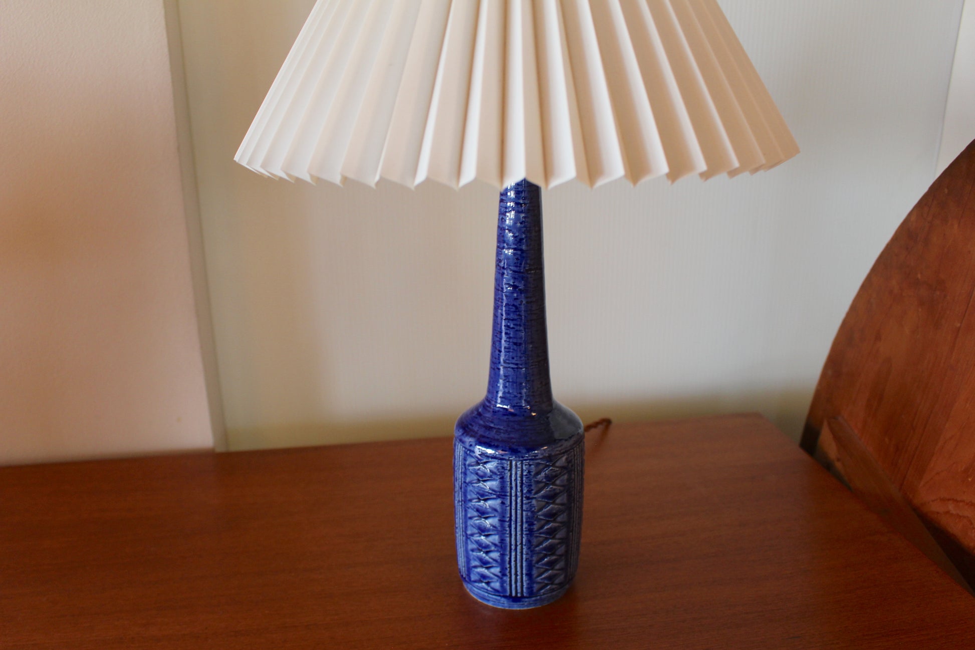 こちらは美しいコバルトブルーの釉薬にに凹凸の模様が施され、形も美しいデンマークのミッドセンチュリーデザインを代表する一品です。ブルーの色味が珍しく、デンマークでも同じものを探すのは困難な希少なランプです。