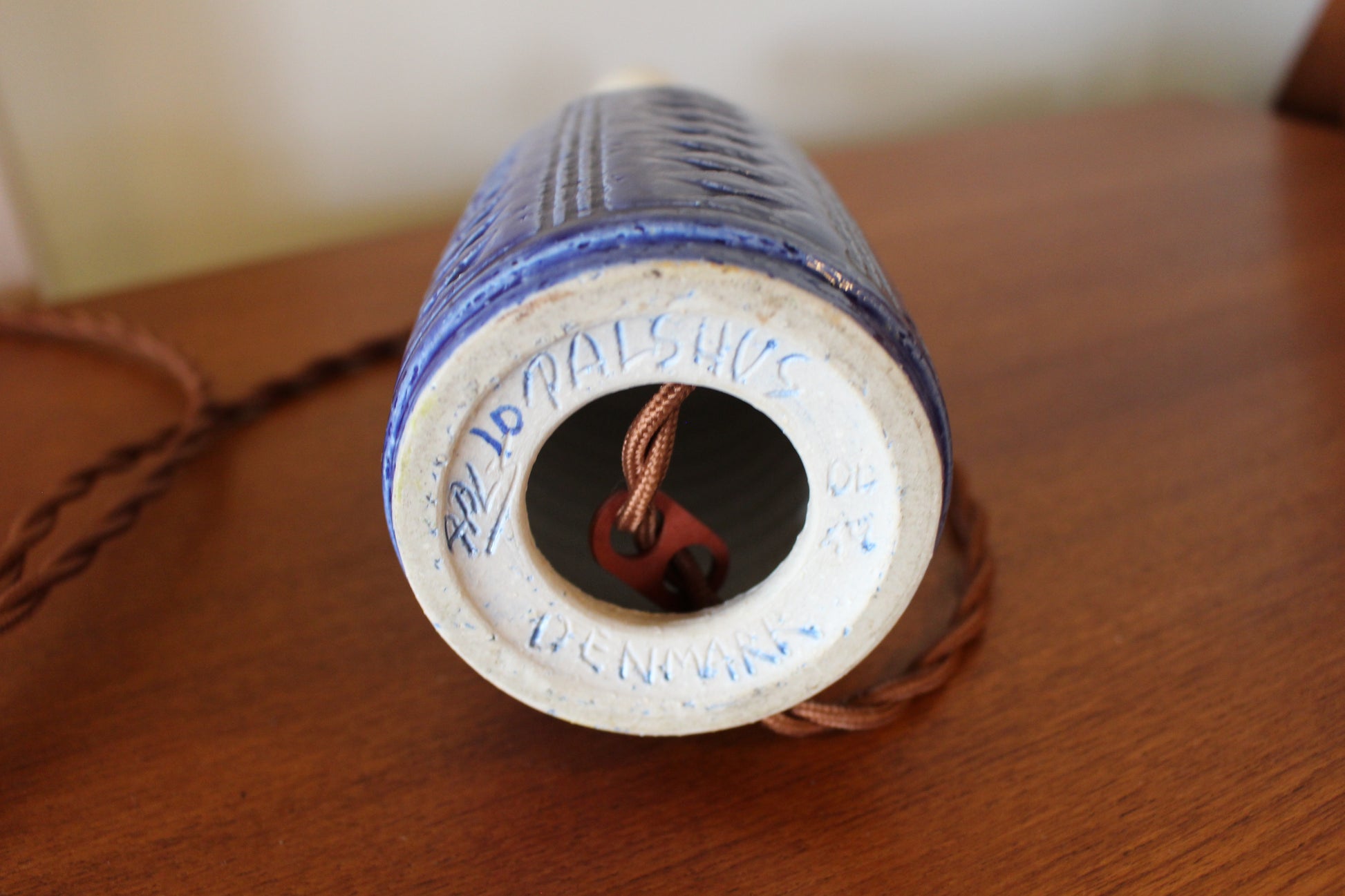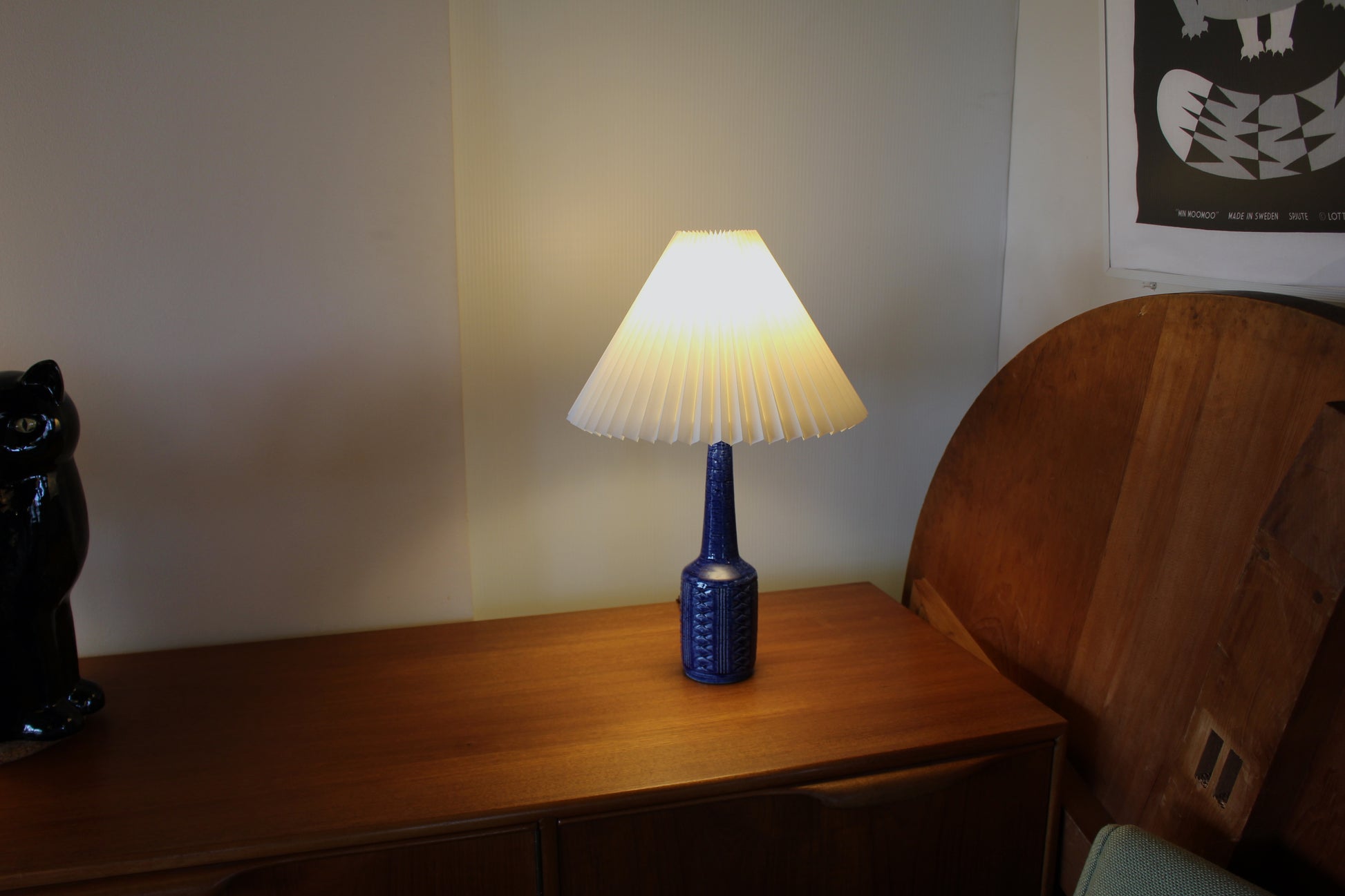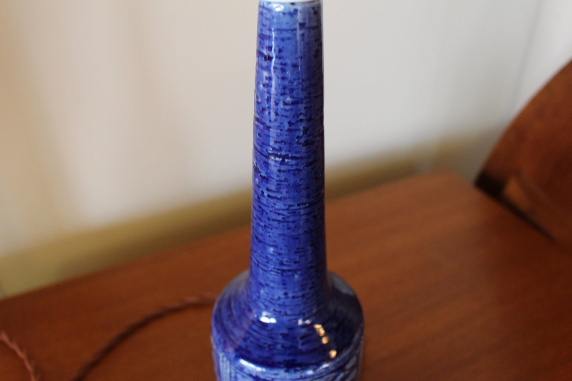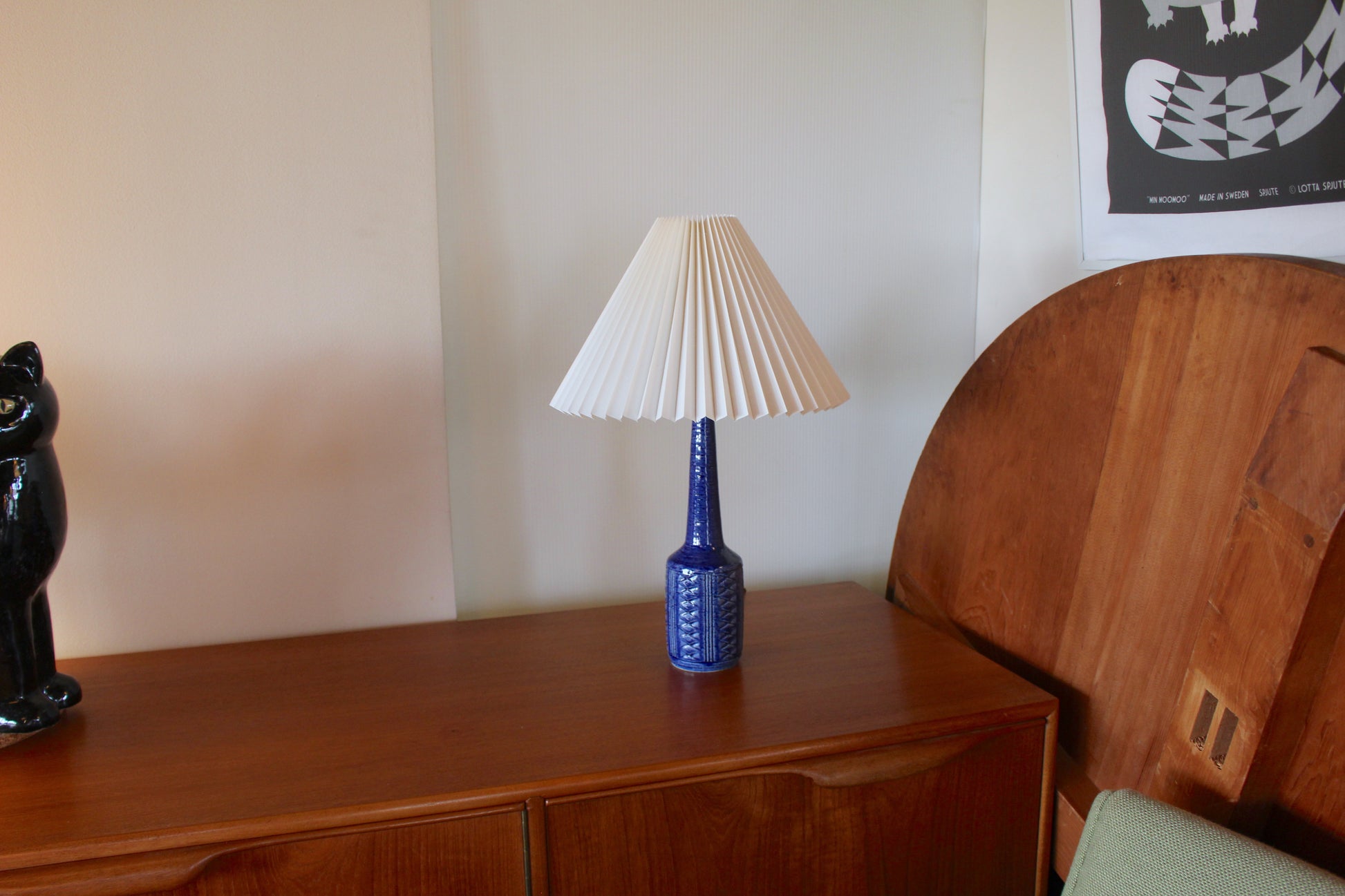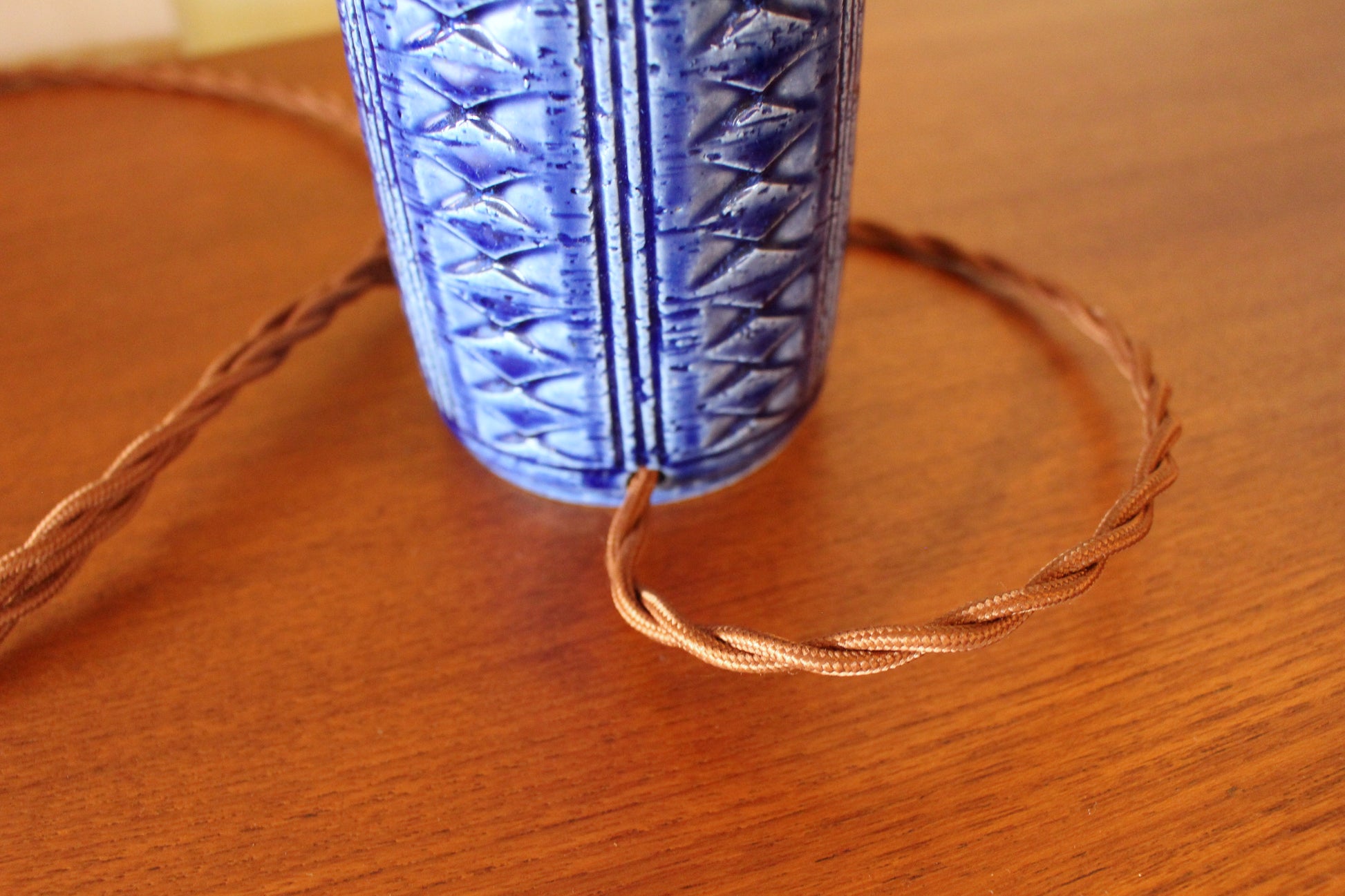 こちらは美しいコバルトブルーの釉薬にに凹凸の模様が施され、形も美しいデンマークのミッドセンチュリーデザインを代表する一品です。ブルーの色味が珍しく、デンマークでも同じものを探すのは困難な希少なランプです。