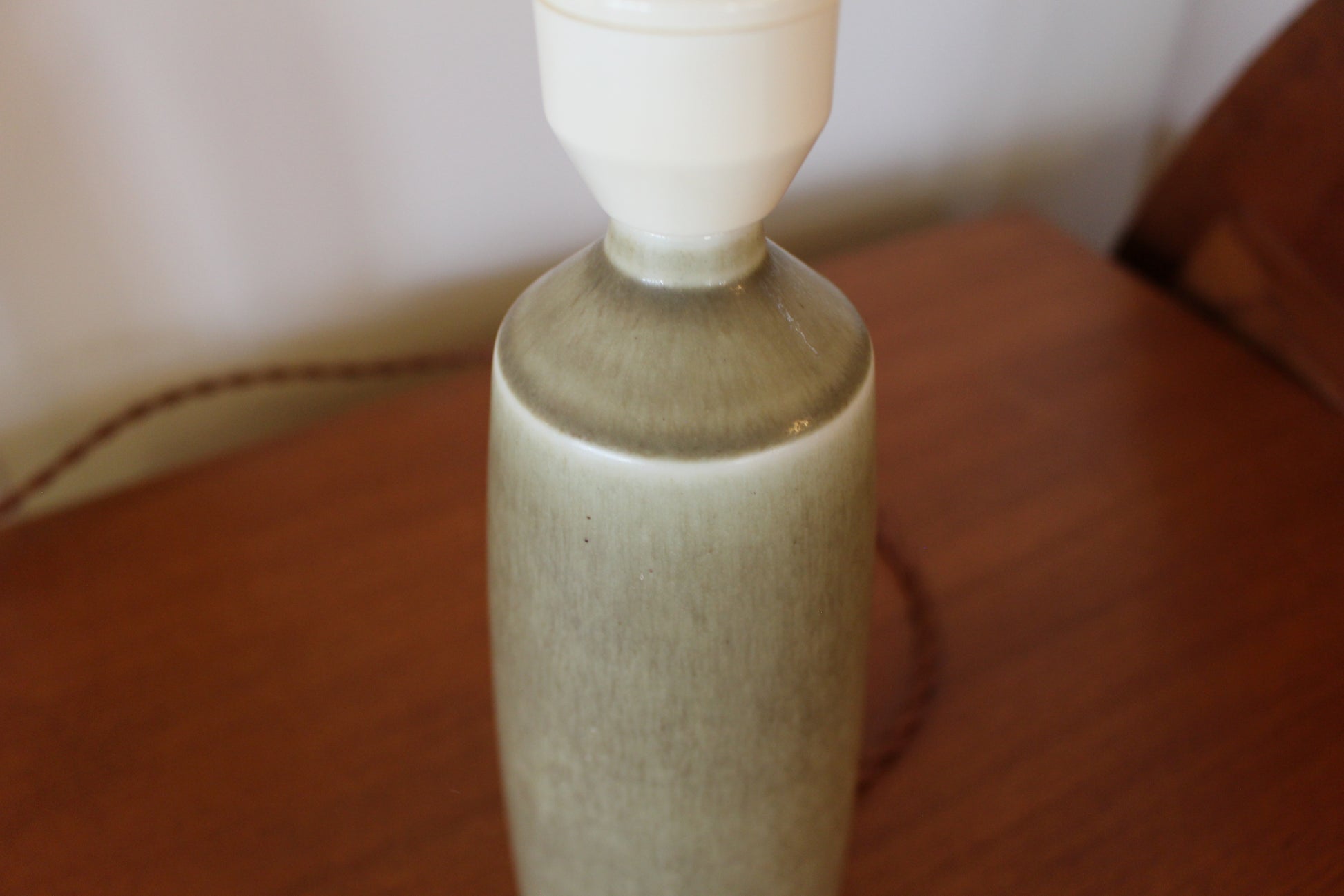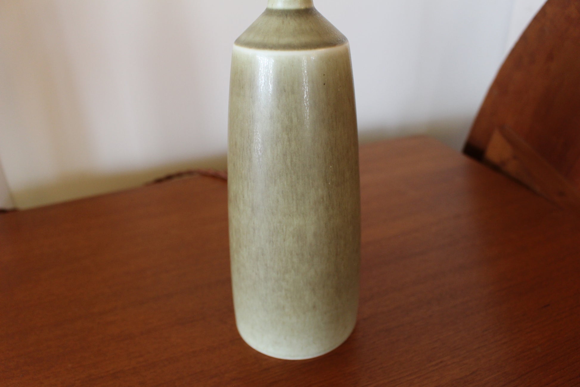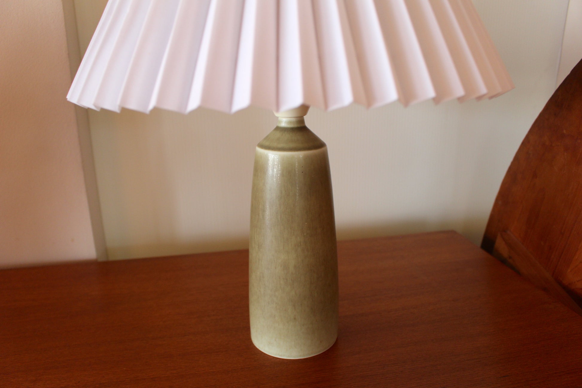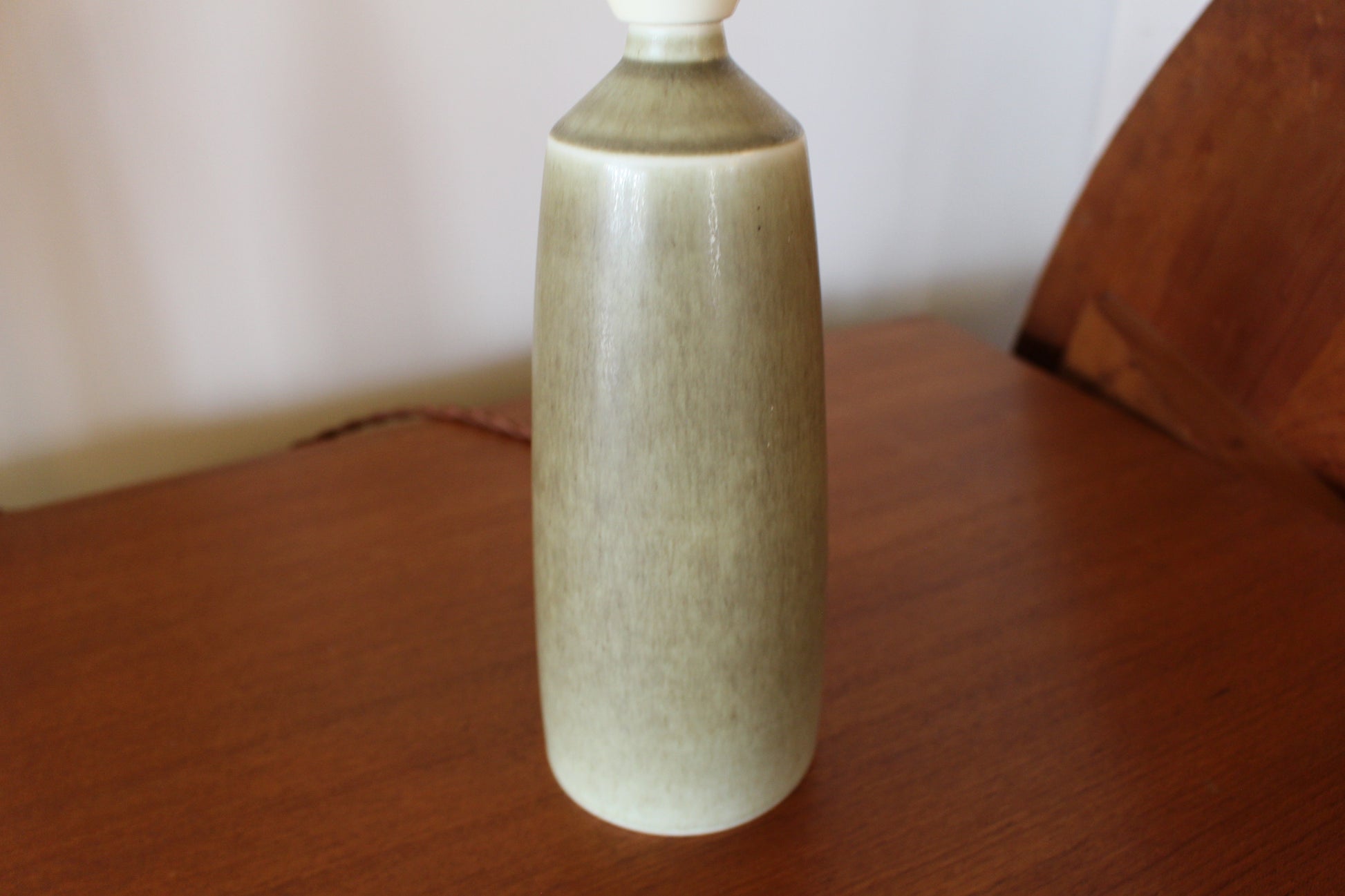 パルシュスの中でも特に希少で人気なのは、日本とスカンジナビアの影響を組み合わせた滑らかなフォルムと釉薬の絶妙な調合が特徴です。こちらはベージュとオリーブグリーンの中間のテーブルランプです。太陽光でも美しく、灯りをつけるとまた違った表情を見せます。