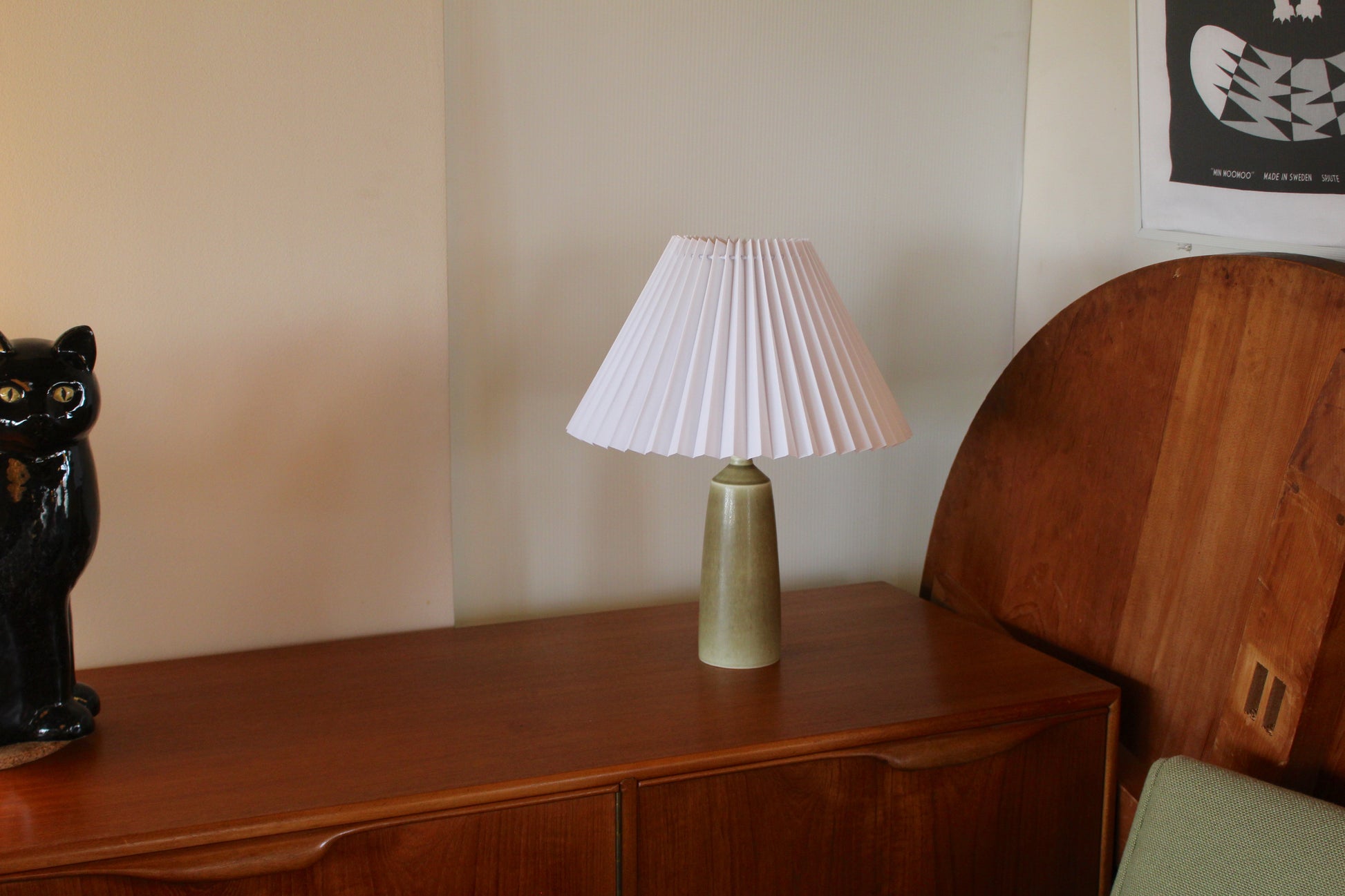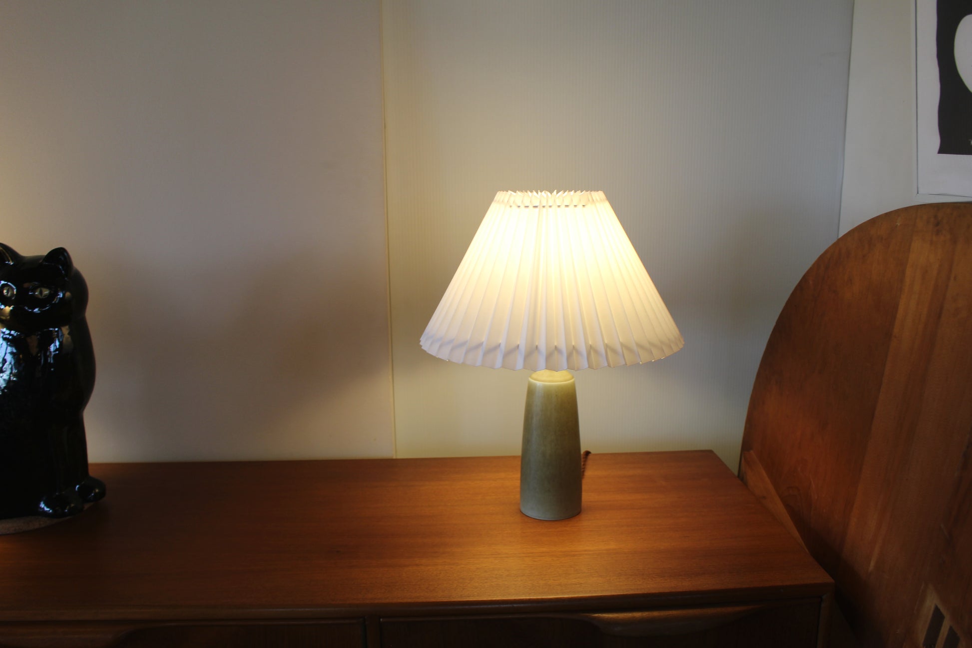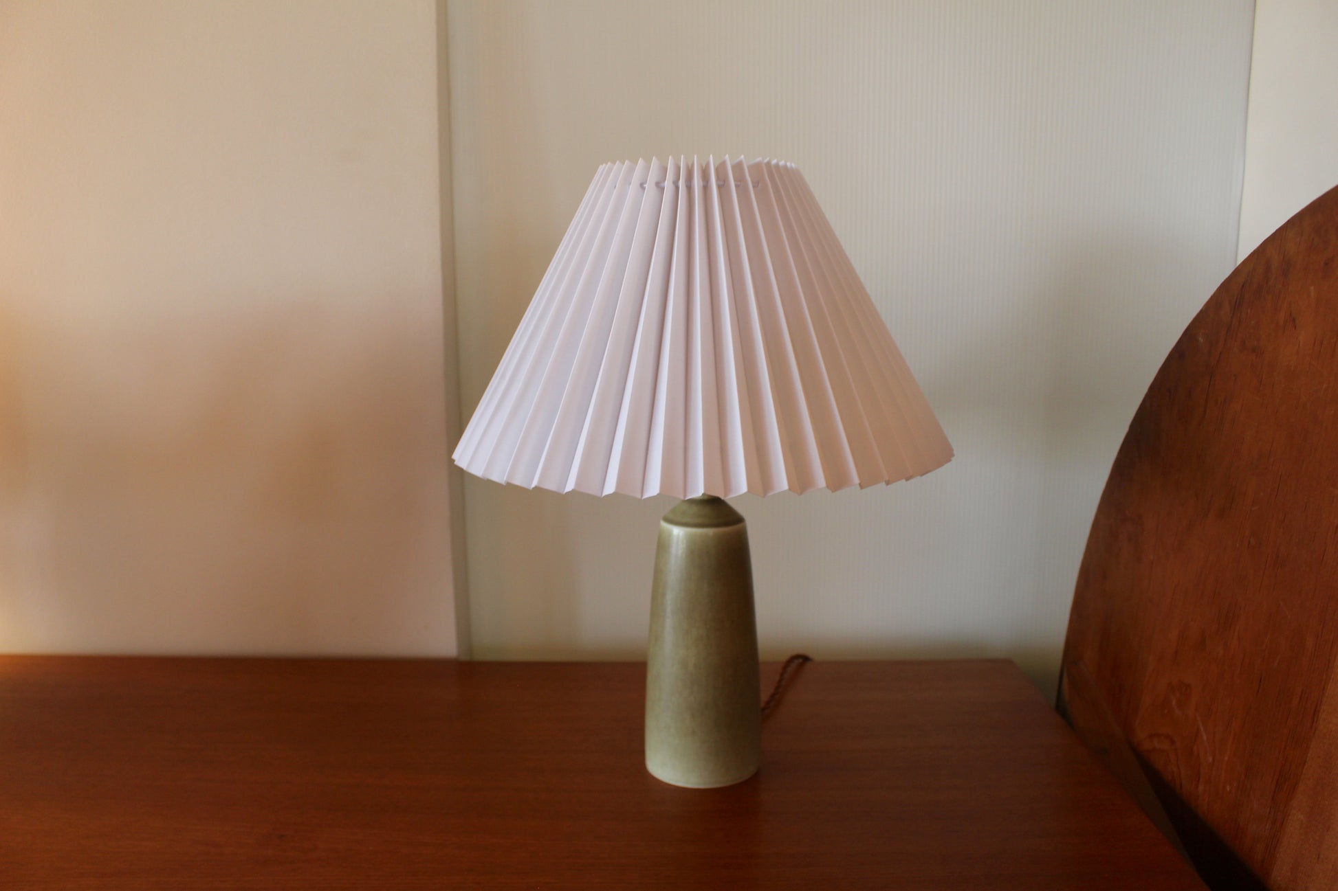 パルシュスの中でも特に希少で人気なのは、日本とスカンジナビアの影響を組み合わせた滑らかなフォルムと釉薬の絶妙な調合が特徴です。こちらはベージュとオリーブグリーンの中間のテーブルランプです。太陽光でも美しく、灯りをつけるとまた違った表情を見せます。