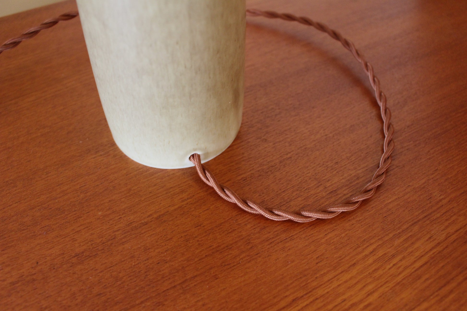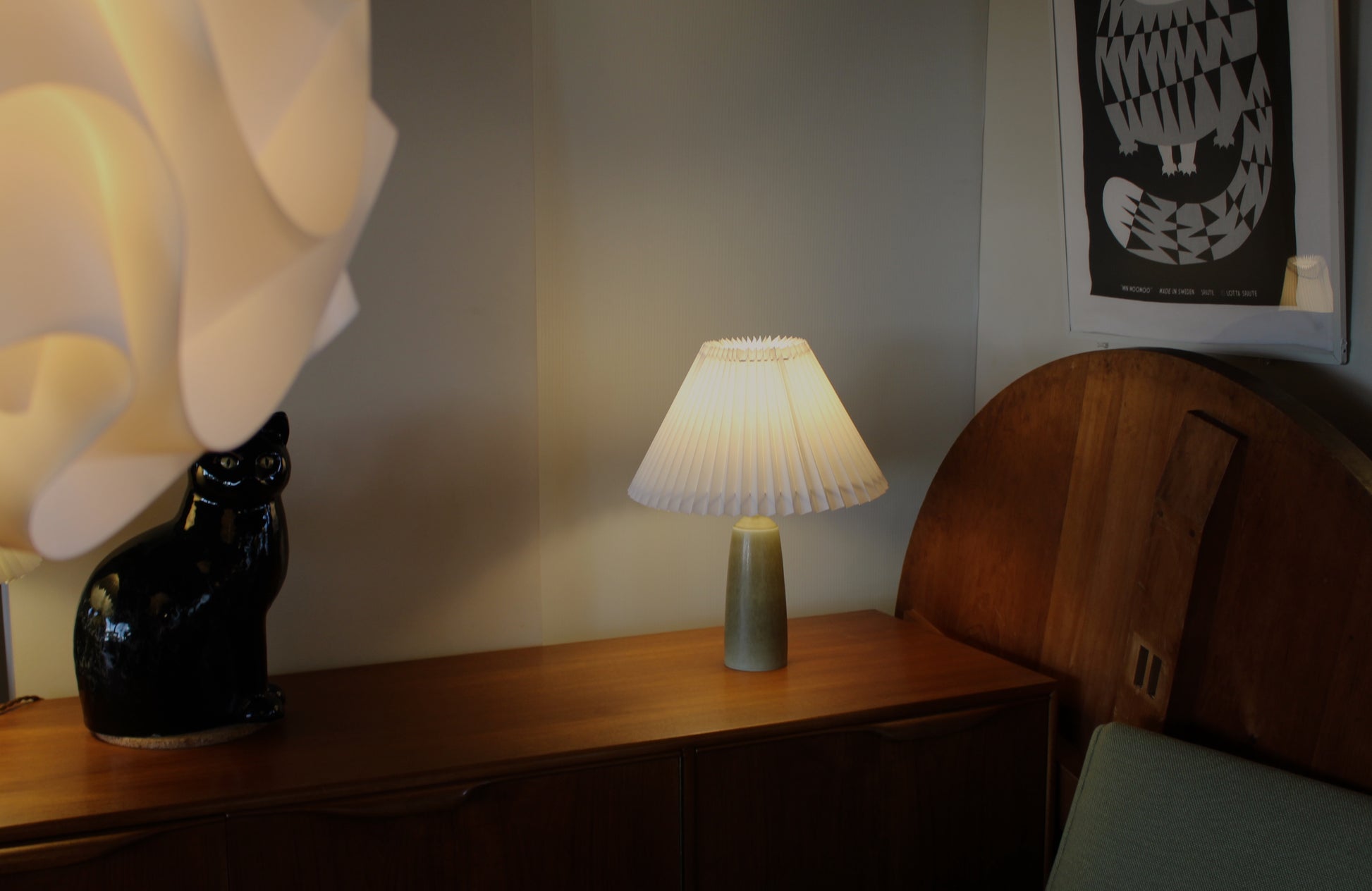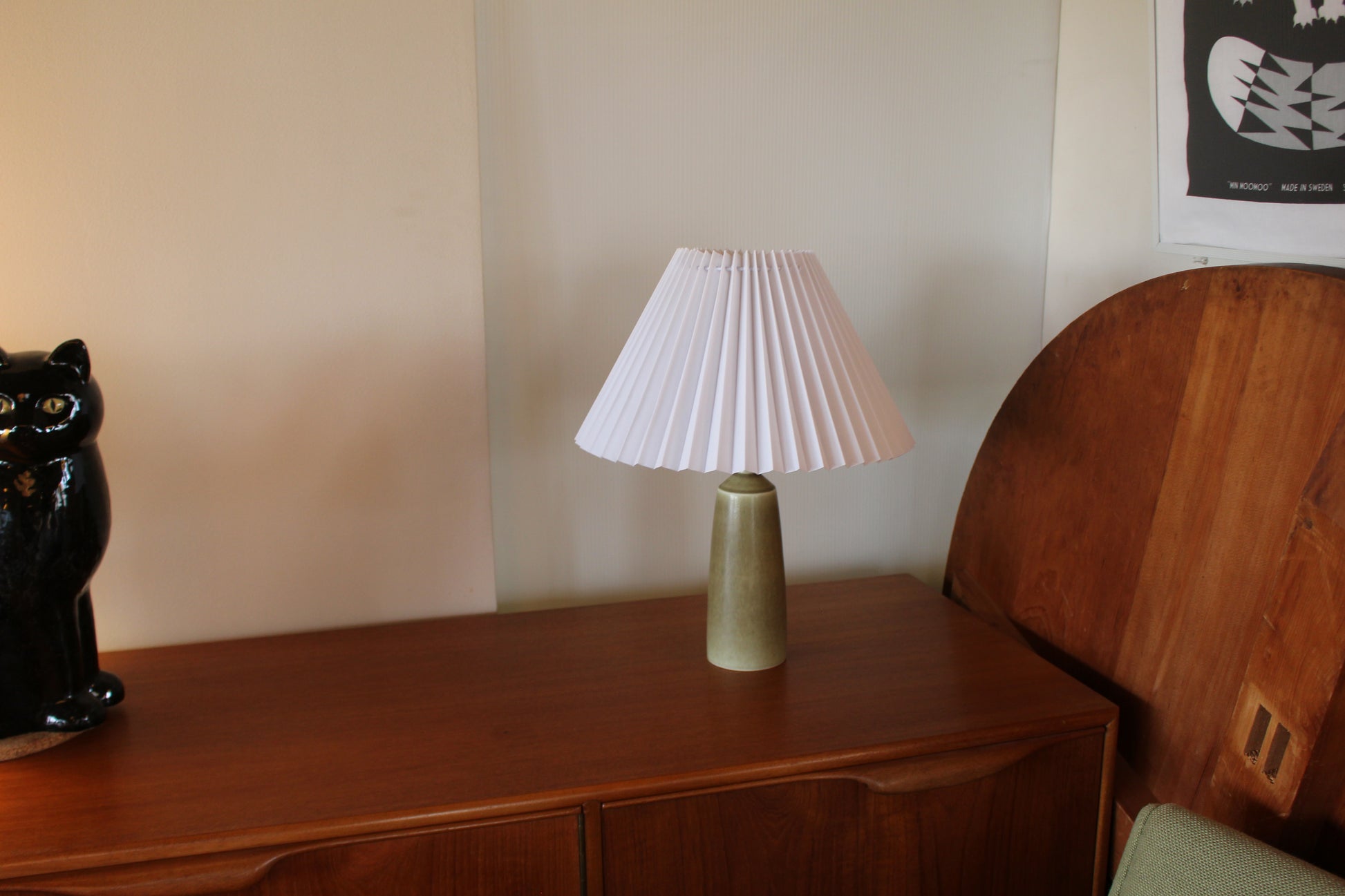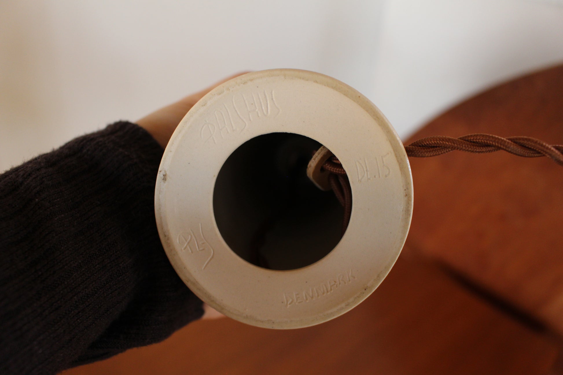 パルシュスの中でも特に希少で人気なのは、日本とスカンジナビアの影響を組み合わせた滑らかなフォルムと釉薬の絶妙な調合が特徴です。こちらはベージュとオリーブグリーンの中間のテーブルランプです。太陽光でも美しく、灯りをつけるとまた違った表情を見せます。